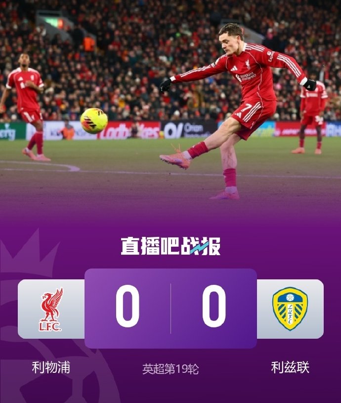 利物浦0比0利兹联利物浦4连胜终结,主客面对利兹联均战平;维尔茨灾难发挥&屡失良机,埃基蒂克失空门,勒温破门但越位在先。