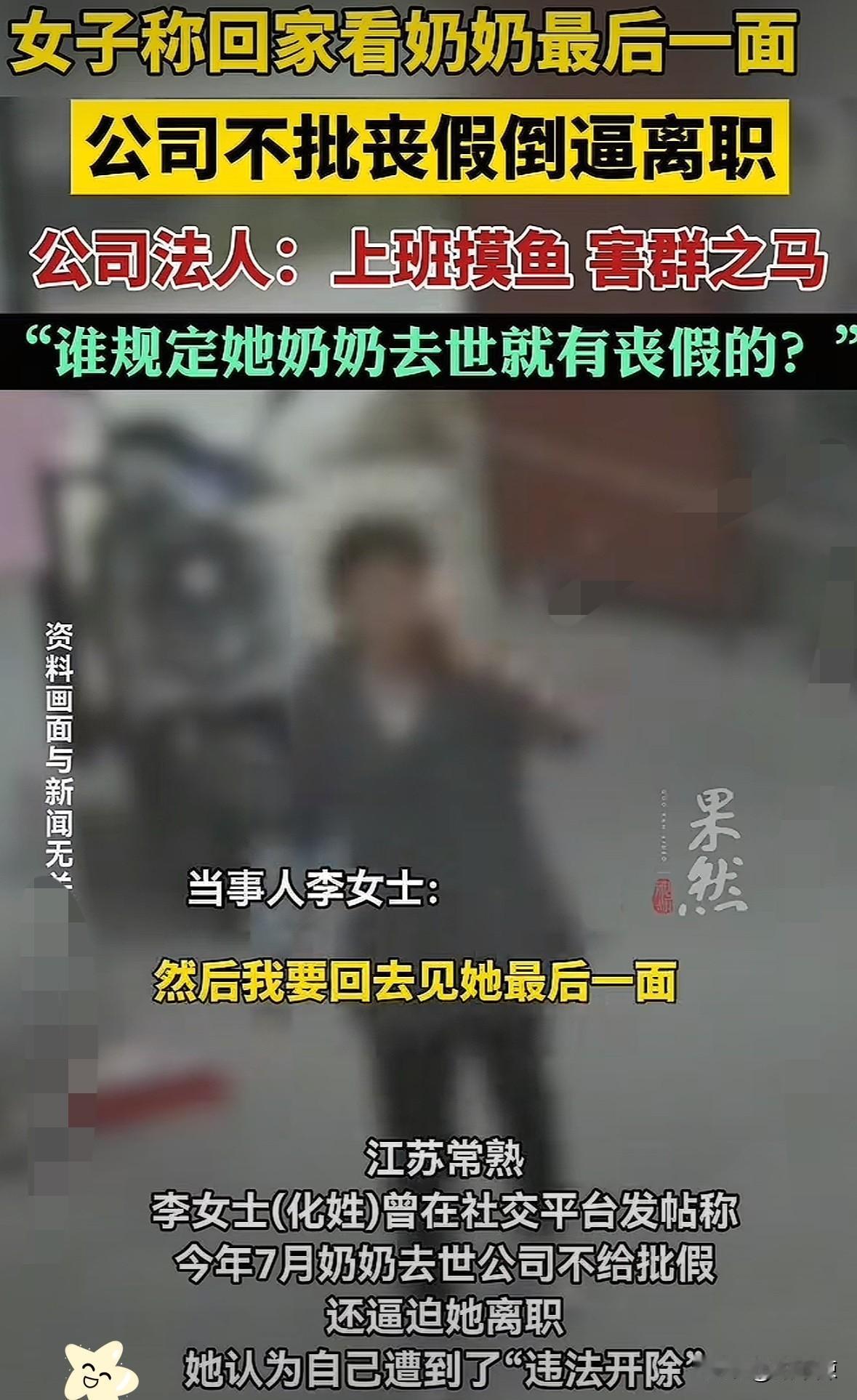 江苏常熟,女子奶奶去世,她向公司人事请完假,坐上回家高铁后,公司突然通知她,老板不同意她的请假申请,还趁机逼迫女子主动离职! 奔丧期间被逼做抉择,事后不仅没拿到赔偿金,干了一年多的社保更是一分没交。 老板张口就骂她“害群之马”,拿“摸鱼”当借口却连个打卡记录、监控证据都没有,甚至嚣张放话“谁爷爷奶奶不过世,虚头巴脑”! 说白了,这哪是请假的事儿,分明是老板记恨她拒绝转岗,借着奔丧的由头公报私仇! 法律早就划清红线:社保是强制义务,违法解除合同要赔2N,再横的老板也不能无视法律! 职场从来不是老板的“一言堂”,连基本人情和法律底线都踩的公司,注定走不长远! 打工人遇到这种糟心事千万别忍,该仲裁就仲裁,合法权益就得硬气捍卫!