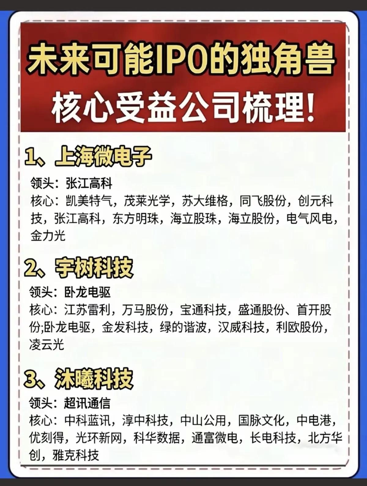 1月2日,节后A股这些板块有望大涨!!! 未来可能IPO的独角兽核心受益公司梳理,重点关注:上海微电子概念:张江高科、凯美特气、海立股份;宇树科技概念:卧龙电驱、江苏雷利、万马股份;长鑫存储概念:重点关注:合肥城建、兆易创新、北方华创!!!