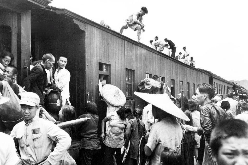 1944年,桂柳会战期间,大批桂林民众为逃避日军推进,拼命挤上湘桂铁路火车,车厢内外、车顶、车门处挤满难民,甚至有人攀爬车顶。 照片中,一名士兵持枪维持秩序,民众携家带口、背行李、戴斗笠,表情焦虑,反映了战乱中平民的绝望与混乱。 1944年,日军发动“一号作战”第三阶段桂柳会战,第11军和第23军约15万兵力从湖南、广东多路南下,目标打通大陆交通线并摧毁美军在桂林、柳州空军基地。中国第四战区约20万部队抵抗,但因指挥失误和保存实力等原因,迅速失利。 随着衡阳(8月)沦陷、日军逼近,桂林当局于6月、9月先后发布三次疏散令,强制民众撤离。火车成为主要逃生工具,但运力有限,黑市车票价格暴涨,民众争相攀爬,导致车顶、车底、车轴间均挤满人,火车如同“流动难民营”。许多人逃往柳州、贵州或乡村,但途中遭轰炸或饥病死亡。11月10日,桂林、柳州同日沦陷,城市遭焦土破坏,房屋99%焚毁,平民伤亡惨重。