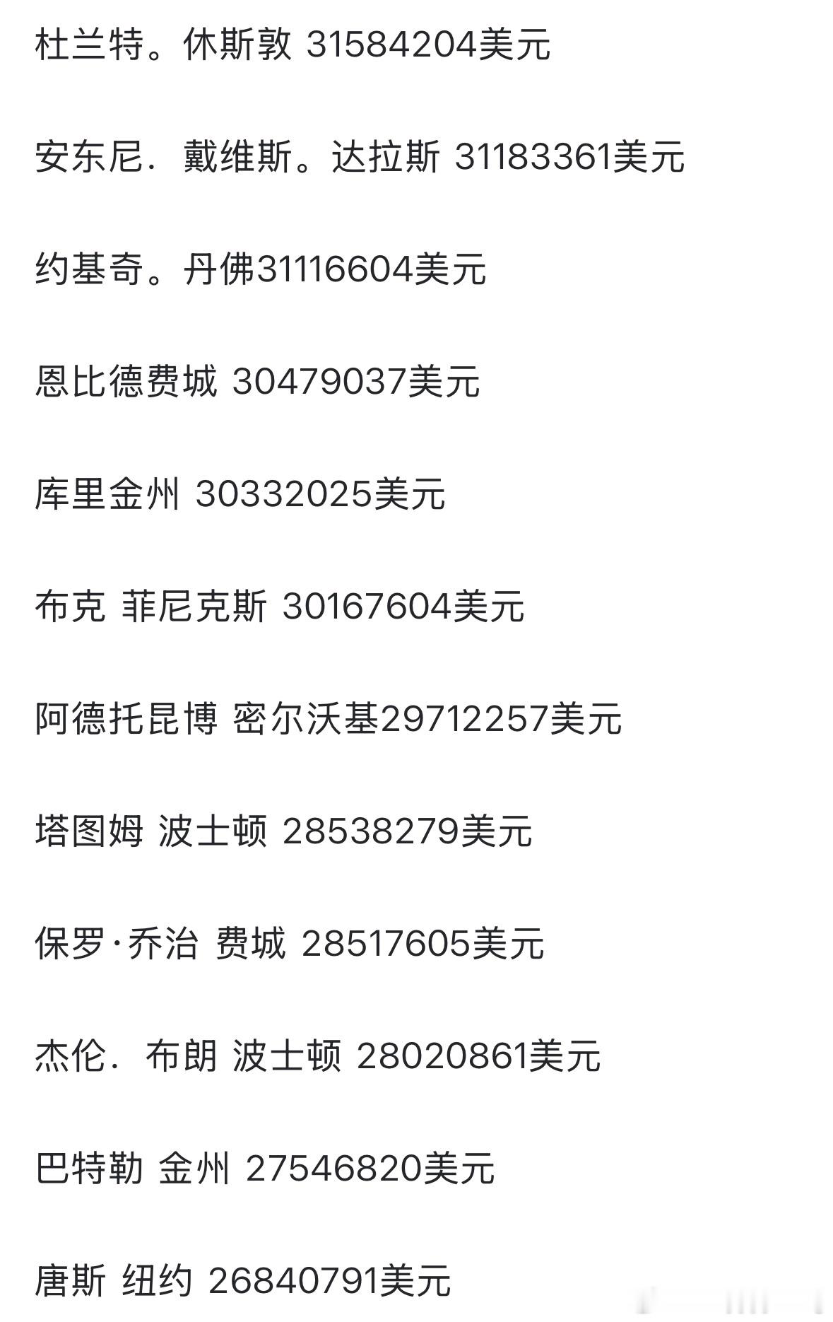 NBA球员税后工资杜兰特居首名记称浓眉会在截止日前被交易杜兰特 第一没毛病,毕竟还有一战之力,人家也还是联盟顶流,就是这个第二吗。。。。换句话说,独行侠是真的在给湖人做慈善😆