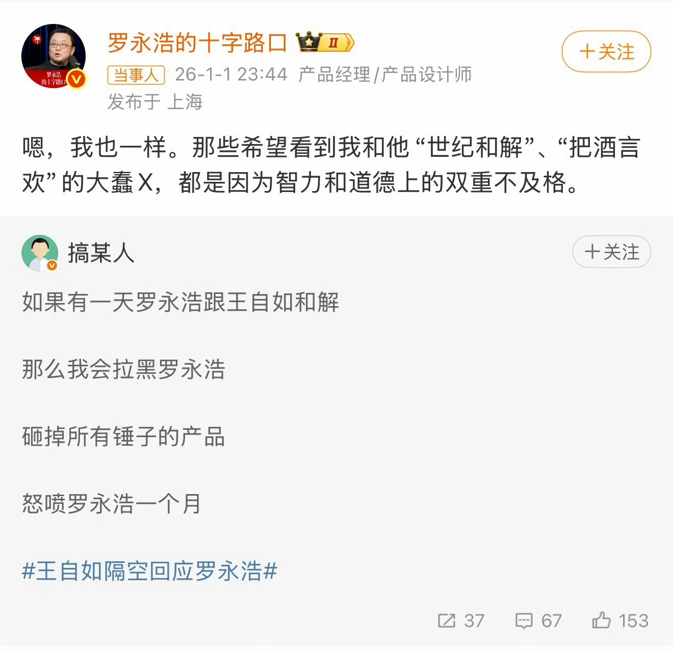 罗永浩回应是否与王自如和解罗老师别上当,他最近一直拿你搞流量,自如老师现在老油条了…