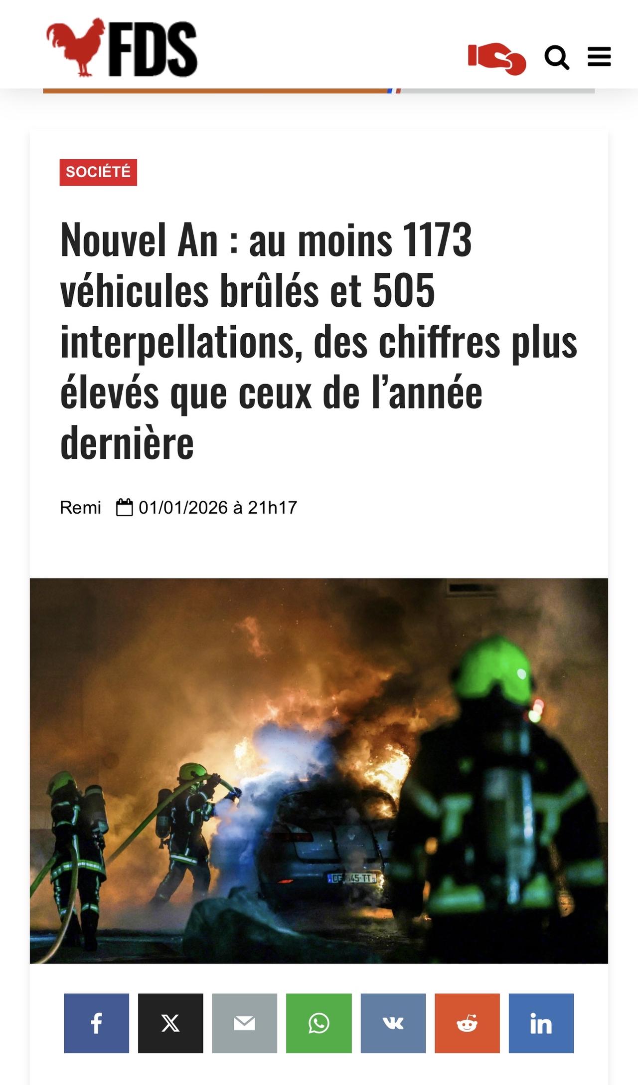 法国宣布,跨年夜共有 1173 辆汽车被纵火焚烧。 比去年增加了19%,去年这个数字是984。 🔴逮捕人数为505人,而去年为420人 🚨 403起拘留事件,去年310起 🔫两名男子在巴黎遭枪击受伤 🗡️马赛一名男子被刺身亡