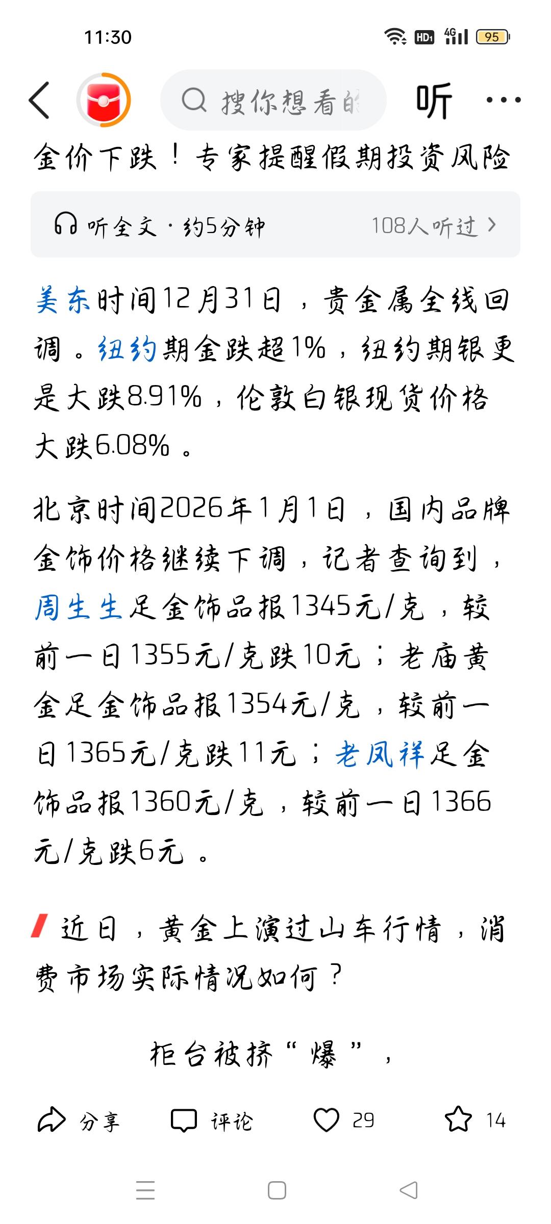 金价下跌,专家提醒假期投资风险,我想说 据鲁中晨报报道,金价下跌,国内品牌金饰价格普遍下跌10元左右,12月31日,国际贵金属回调,纽约期金跌超1%,纽约期银更是大跌8.91%,伦敦白银现货价格跌6.08%,面对金价下跌,专家提醒假期投资风险,我想说,全银下跌是必然的,因为涨得太快了,回调是必然的,有人说,回调是否可以买呢?我只能你得赌未期,你认为未来会涨,可以买,当然买了是否一定会涨呢?尽管专家们说,金银长期向好,假如你在高位买,风险更大,要买的话也是少量买。各位条友觉得呢?