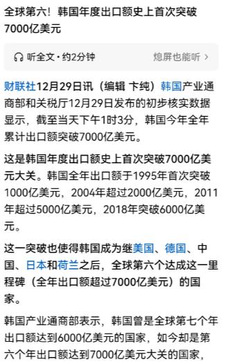 韩国出口突破7,000亿美元,还是挺牛逼的,这么小一个国家,确实是一个工业强国,他的工业制造还挺强的。在世界能够排名第6位,想一想还是有点恐怖的啊!   7000亿美元的出口额,对于一个国土面积仅10万平方公里、人口不足5200万的国家而言,无疑是个足以震撼全球贸易市场的数字。   韩国成为全球第六个达成这一里程碑的国家,看似是其工业实力的又一次印证,但剥离数据的光环,这场出口盛宴的真实成色与可持续性,更值得深入拆解。   从增长本质来看,这一成绩的核心驱动力是半导体产业的超级周期,全球AI热潮催生的高带宽内存需求,让韩国在该领域的垄断优势得以集中释放。   数据显示,2025年11月韩国半导体出口额占总出口额的比重已飙升至28.3%,而20年前这一比例仅维持在10%左右,这种结构性倾斜让出口增长严重依赖单一产业的周期波动。   与此同时,韩元贬值与通胀因素进一步放大了出口额的名义增长。   2025年下半年韩元兑美元累计下跌超8%,虽在短期提振了出口价格竞争力,却也加剧了输入型通胀。   韩国核心通胀与整体通胀均已超过央行2%的目标水平,这种以货币贬值为代价的出口增长,本质上是对国内购买力的转移补贴。   韩国产业通商资源部的数据清晰显示,2025年1-11月累计出口额的2.9%同比增长,完全由半导体、汽车等少数品类支撑,剔除半导体后,其余产业出口同比下滑1.5%。   在主要15个出口品类中,石油化工、钢铁、无线通信设备等传统优势产业均出现不同程度萎缩,其中石化产品下降11.7%,钢铁出口下滑超8%。   这种产业失衡让韩国经济逐渐陷入类似资源出口国的困境,承受着高科技产业的战略脆弱性与周期性波动风险。   更值得警惕的是,出口的结构性失衡已传导至企业投资端。   调查显示,40%的韩国大型企业计划2026年减少国内投资,仅有25%计划扩大投入,反而有45.7%的企业打算加码海外支出。   这种外热内冷的投资格局,既是企业规避美国关税等外部风险的被动选择,也可能进一步加剧本土产业空心化,削弱长期经济复苏的根基。   但从全球贸易格局来看,韩国出口排名的提升,更多是特定产业周期下的阶段性表现,而非全面竞争力的跨越。   2025年韩国出口逼近日本,两国差距收窄至不足300亿美元,这一成绩被产业界解读为追赶的重要突破,但需注意的是,这种差距缩小完全依赖半导体产业的爆发。   同期日本出口结构更为均衡,在精密机械、高端材料等多个领域仍保持稳定优势,一旦半导体周期回落,韩日出口差距大概率会再次拉大。   市场多元化的表面进展也难以掩盖深层依赖。   尽管韩国对中美出口占比有所下降,对越南、欧盟等市场的出口实现增长,但新增市场的增量本质上仍与半导体产业链高度绑定。   如对中国台湾地区出口的近46%激增,核心驱动力就是HBM半导体供应,这种“换市场不换产业”的多元化,并未从根本上降低外部环境变化带来的风险敞口。   回到“出口高增长是否等于经济强”的核心问题,韩国的案例给出了明确的否定答案。   出口对韩国GDP的拉动效应已呈现边际递减,尽管韩国央行因出口亮眼将2025年GDP增长预期从0.9%上调至1%,但这一微调仍反映出经济复苏的疲软。   1960-2014年韩国净出口对GDP增长的平均贡献度达30.3%,而当前单一产业驱动的出口增长,对整体经济的传导效果已大幅弱化。   各大投资银行纷纷下调韩国2025年经济增长预测,进一步印证了市场对其经济前景的担忧。   高汇率、高油价、高贸易冲突风险与通胀压力相互交织,让韩国经济陷入“出口亮眼但内需低迷”的分裂状态。   居民购买力持续被削弱,国内需求的疲软最终会反过来制约出口产业链的可持续发展。   不可否认,韩国以小国之姿实现出口规模的全球第六,其在半导体、船舶等高端制造领域的技术积累值得肯定,称其为“工业强国”有一定道理。   但我们更应看到,7000亿美元的出口额,是产业周期红利、货币贬值与通胀共同作用的结果,背后隐藏着结构失衡、投资外流、内需疲软等多重隐忧。   全球贸易的竞争早已从规模比拼转向质量竞争,单一产业的爆发可以成就短期的出口奇迹,却无法支撑长期的经济稳健。   对于韩国而言,7000亿美元更像是一个警示信号:若不能借当前的出口红利推动产业结构多元化,加快培育新的增长引擎,这场高光时刻大概率会随着半导体周期的落幕而昙花一现。   这个小小的工业强国,未来能否真正实现从“出口规模领先”到“经济质量过硬”的跨越,关键不在于如何延续单一产业的辉煌,而在于能否破解结构失衡的深层困境。   这不仅是韩国经济需要回答的问题,也为全球其他出口导向型经济体提供了重要启示。