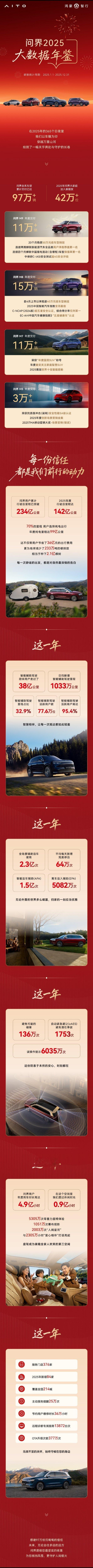 【将迎百万里程碑:鸿蒙智行问界全系车型累计交付突破 97 万辆】鸿蒙智行问界汽车官方发布“问界 2025 年大数据年鉴”,公布了最新销量情况、车主驾驶数据等。其中提到,问界全系车型累计交付超 97 万辆,2025 年新增车主超 42 万位。按照当前的交付节奏来看,问界有望在 2026 年 1 月交付破百万。问界 M9 年度交付超 11 万辆;问界 M8 年度交付超 15 万辆;问界 M7 年度交付超 11 万辆;问界 M5 年度交付超 3 万辆。问界用户累计行驶总里程已突破 234 亿公里、2025 年度行驶总里程达 142 亿公里。另外,今年智能辅助驾驶里程达 38 亿公里(日均新增里程 1033 万公里),占比 32.9%,智能辅助驾驶活跃用户数达 77.6 万位,占比 95.4%。问界(AITO)是赛力斯联手华为推出高端智慧汽车品牌,发布于 2021 年,目前该品牌产品包括:问界 M9 系列全景智慧旗舰 SUV、问界 M8 系列家庭智慧旗舰 SUV、问界 M7 系列幸福旗舰、问界 M5 系列 SUV。
