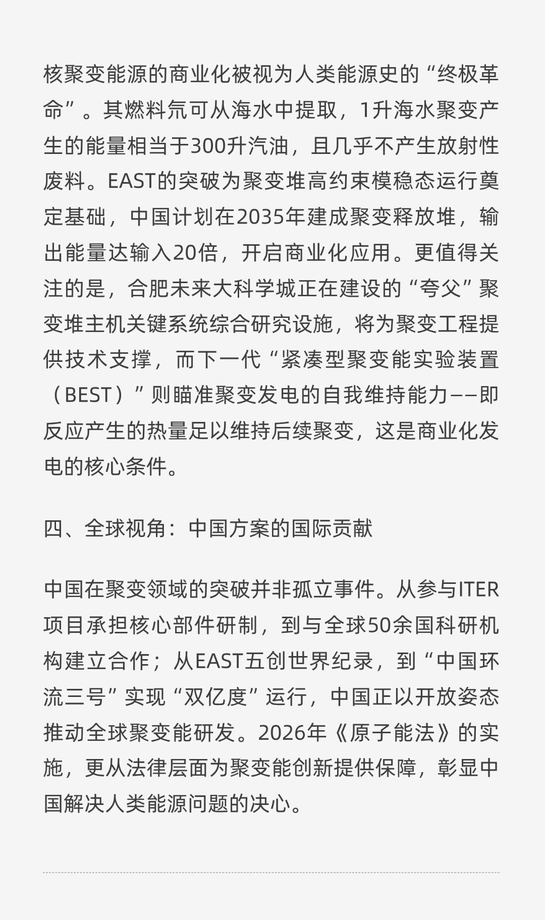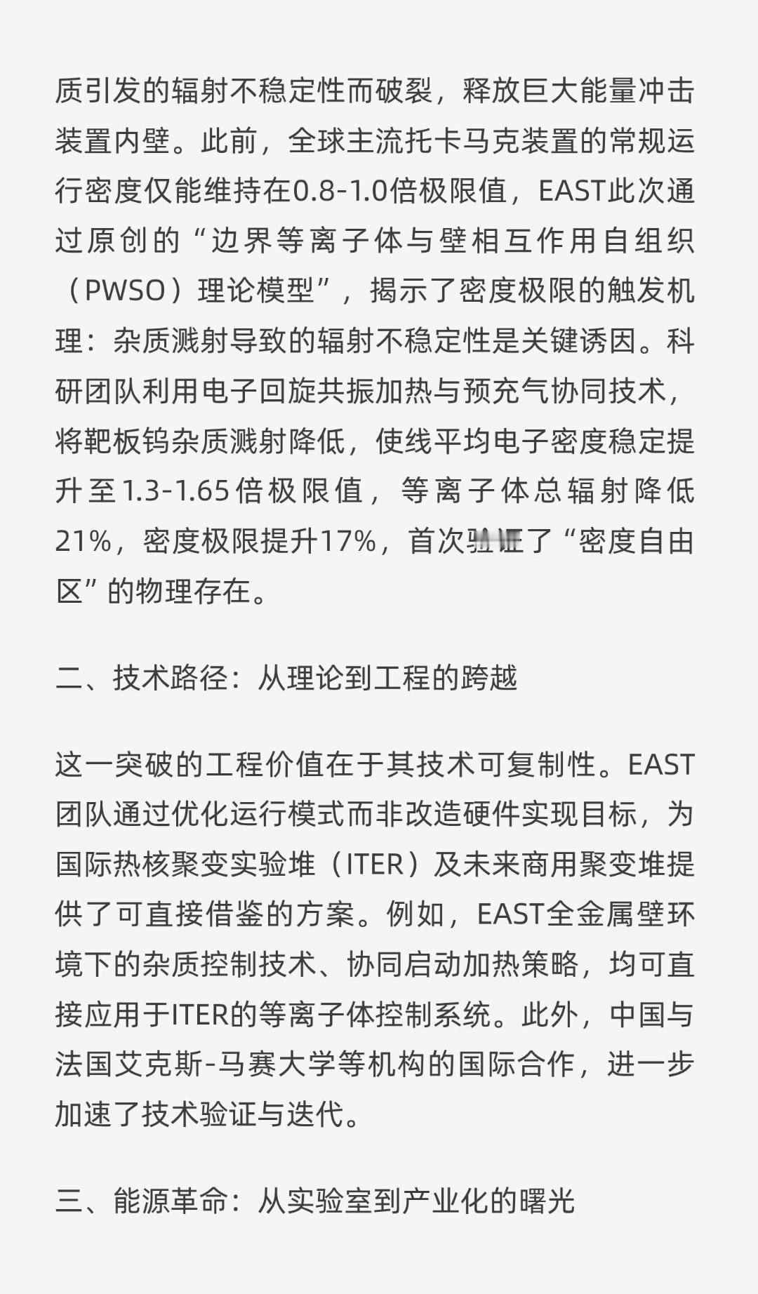 | 2026年新年伊始,中国科学院合肥物质科学研究院宣布全超导托卡马克核聚变实验装置(EAST)实现重大突破——首次证实托卡马克“密度自由区”存在,突破传统密度极限,为磁约束核聚变装置的高密度稳定运行提供关键物理依据。这一突破不仅是中国可控核聚变研究的里程碑,更标志着人类向清洁能源终极目标迈出关键一步。托卡马克装置通过磁场约束上亿摄氏度等离子体实现核聚变,但等离子体密度存在理论极限。当密度接近“格林沃尔德极限”时,等离子体会因边界杂质引发的辐射不稳定性而破裂,释放巨大能量冲击装置内壁。此前,全球主流托卡马克装置的常规运行密度仅能维持在0.8-1.0倍极限值,EAST此次通过原创的“边界等离子体与壁相互作用自组织(PWSO)理论模型”,揭示了密度极限的触发机理:杂质溅射导致的辐射不稳定性是关键诱因。科研团队利用电子回旋共振加热与预充气协同技术,将靶板钨杂质溅射降低,使线平均电子密度稳定提升至1.3-1.65倍极限值,等离子体总辐射降低21%,密度极限提升17%,首次验证了“密度自由区”的物理存在。EAST团队通过优化运行模式而非改造硬件实现目标,为国际热核聚变实验堆(ITER)及未来商用聚变堆提供了可直接借鉴的方案。例如,EAST全金属壁环境下的杂质控制技术、协同启动加热策略,均可直接应用于ITER的等离子体控制系统。此外,中国与法国艾克斯-马赛大学等机构的国际合作,进一步加速了技术验证与迭代。核聚变能源的商业化被视为人类能源史的“终极革命”。其燃料氘可从海水中提取,1升海水聚变产生的能量相当于300升汽油,且几乎不产生放射性废料。EAST的突破为聚变堆高约束模稳态运行奠定基础,中国计划在2035年建成聚变释放堆,输出能量达输入20倍,开启商业化应用。更值得关注的是,合肥未来大科学城正在建设的“夸父”聚变堆主机关键系统综合研究设施,将为聚变工程提供技术支撑,而下一代“紧凑型聚变能实验装置(BEST)”则瞄准聚变发电的自我维持能力——即反应产生的热量足以维持后续聚变,这是商业化发电的核心条件。从参与ITER项目承担核心部件研制,到与全球50余国科研机构建立合作;从EAST五创世界纪录,到“中国环流三号”实现“双亿度”运行,中国正以开放姿态推动全球聚变能研发。2026年《原子能法》的实施,更从法律层面为聚变能创新提供保障,彰显中国解决人类能源问题的决心。这场科学革命的终极目标,是让“人造太阳”照亮人类文明的未来。当聚变发电从实验室走向电网,人类将彻底摆脱化石能源依赖,开启清洁、安全、无限的能源新时代。中国科研团队的每一次突破,都在缩短这一梦想照进现实的时间。
