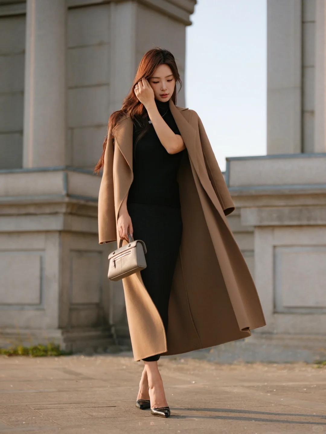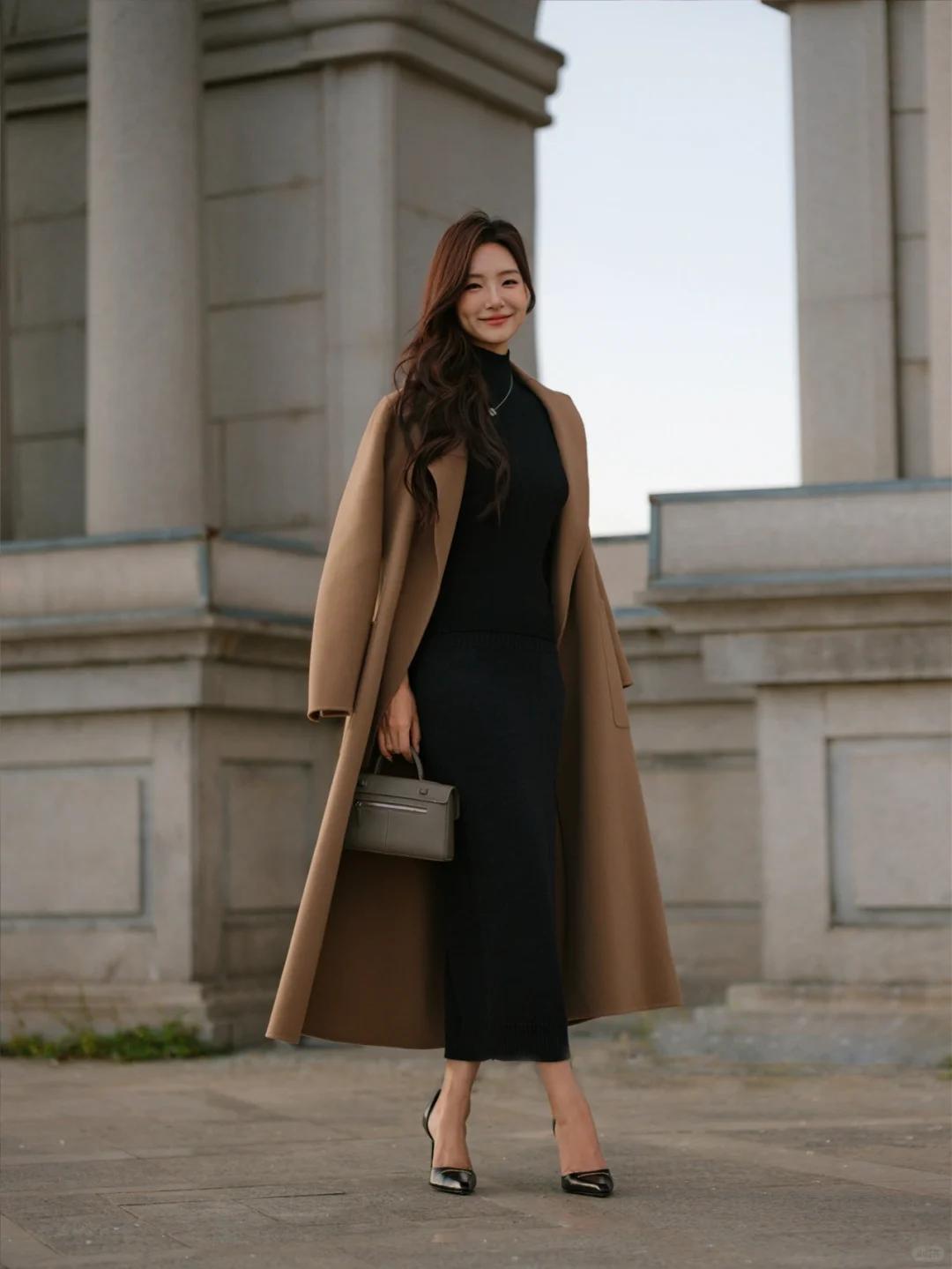 冬季职场大女主的简约高级穿搭秘籍 在冬季,简约风穿搭宛如一股清流,以纯粹质感诠释高级优雅,这套驼色系职场穿搭便是典范。 驼色长款大衣,自带温暖质感与大气格调,长款设计走路带风,气场瞬间拉满。内搭黑色修身高领针织衫,经典黑白配,简约又显瘦,高领设计还增添了几分优雅与知性。下半身的包臀长裙,完美勾勒出身材曲线,尽显女性的柔美与妩媚。 脚蹬一双黑色细高跟,不仅拉长腿部线条,更提升了整体气质,每一步都走出自信风采。再搭配一个灰色手提包,灰色低调沉稳,与驼色和黑色相得益彰,为整体造型增添了一份精致感。 这身穿搭无论是出席重要商务会议,还是日常职场通勤,都能让你成为焦点,轻松展现职场大女主的强大气场与优雅魅力,值得每一位追求品质与格调的女性借鉴。图片来源于博主:CICI菜