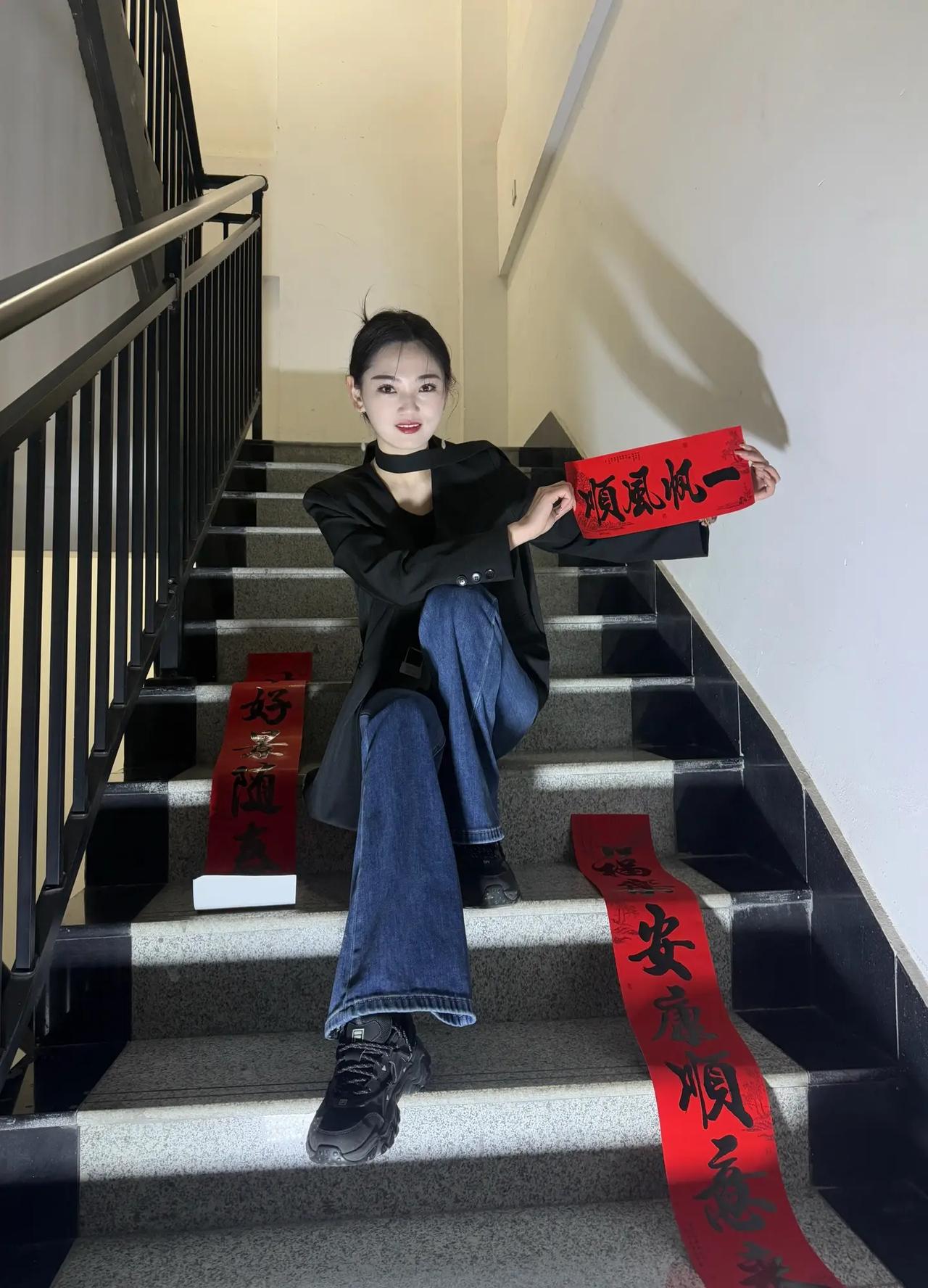 红衣美人倚古门,优雅气质显风姿