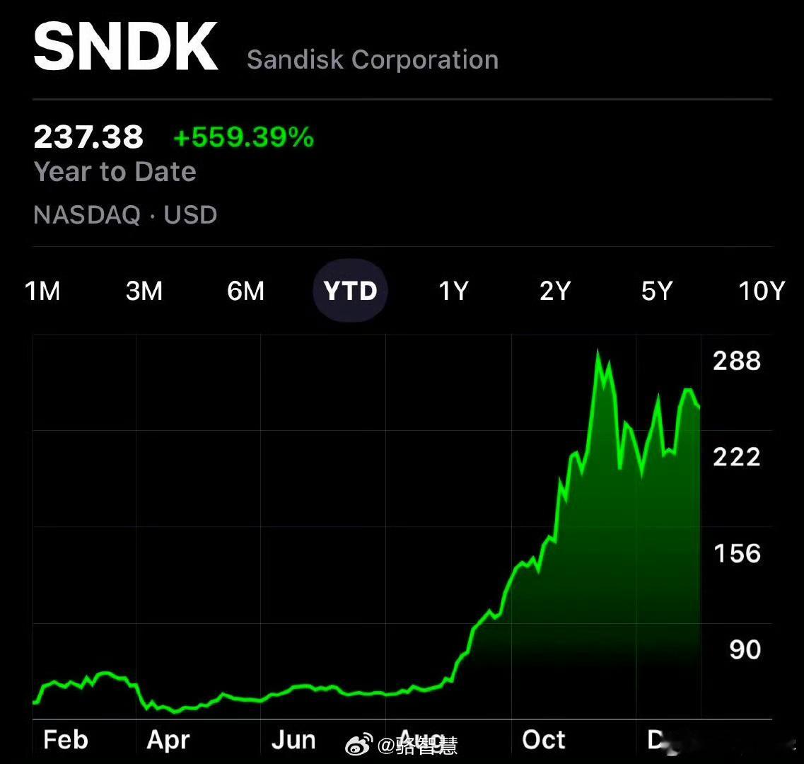 闪迪股价飙涨559% AI的竞争最终就是算力和存储的比拼,中美两国的人工智能企业都在疯狂囤芯片,目前全球明显是供不应求了。现在不只是闪存,CPU、存储等公司都是最大的潜力股。