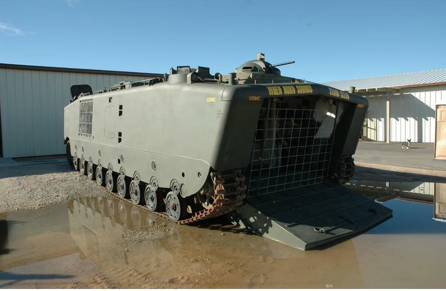 美国LVTP-5两栖装甲车LVTP-5(Landing Vehicle Track Personnel-5)两栖装甲车是美国海军陆战队在20世纪50年代至70年代使用的两栖履带装甲车,有多种型号,包括地雷清扫车、指挥车、救援拖吊车和火力支援车等,最常见的是装甲运兵车。虽然LVTP-5两栖装甲车相对之前的同类装甲车来说,其装甲有所加固,但敌方火力也在加强,所以它在面对敌方诸如火箭筒之类的武器时,仍不能有效防御。油箱的设计位置在兵员舱的下方,在地雷威力波及下汽油容易因此诱爆,以实战观点而言设计并不成功。另外,该车的固定武装只有1挺机枪,火力相对不足。因此,美军通常会利用LVTP-5装甲运兵车的大容量货舱进行应急改装,比如堆放沙包增强防御能力,装备无后座力炮或迫击炮提供更有效地火力掩护等。|