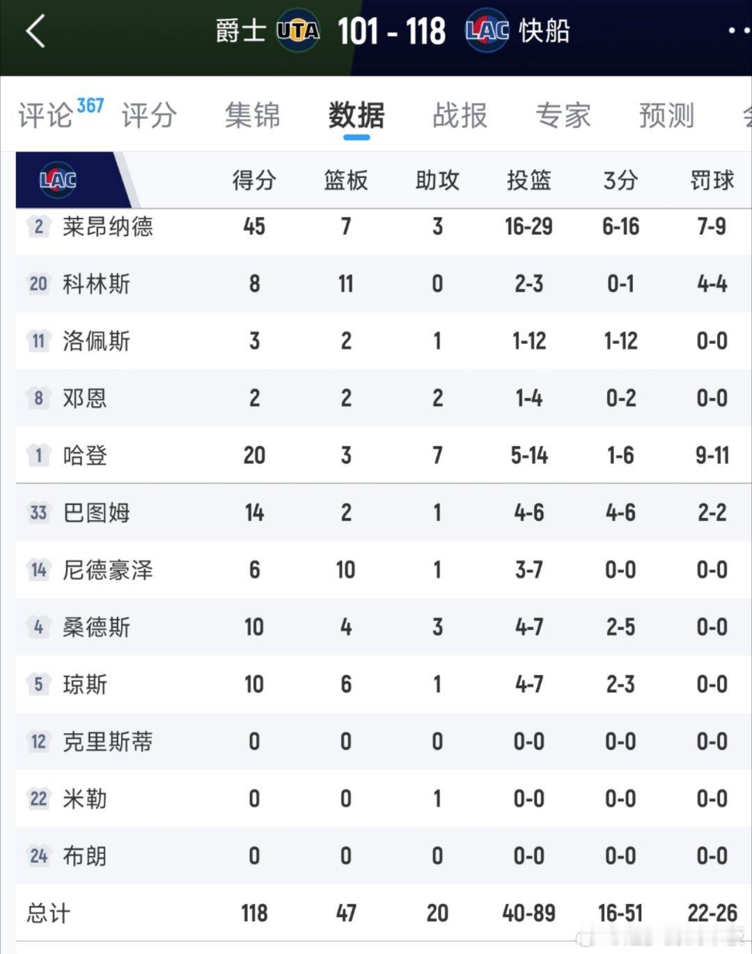 快船末节发力,主场118-101大胜爵士,取得6连胜🔥快船排名反超爵士,升至西部第11,伦纳德轰下45分,哈登20分7助攻;李凯尔22分8板爵士vs快船
