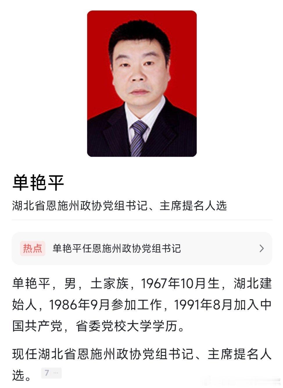 单艳平已任恩施州政协党组书记、主席提名人选,他曾与陈行甲搭班子,后接任巴东县委书记。