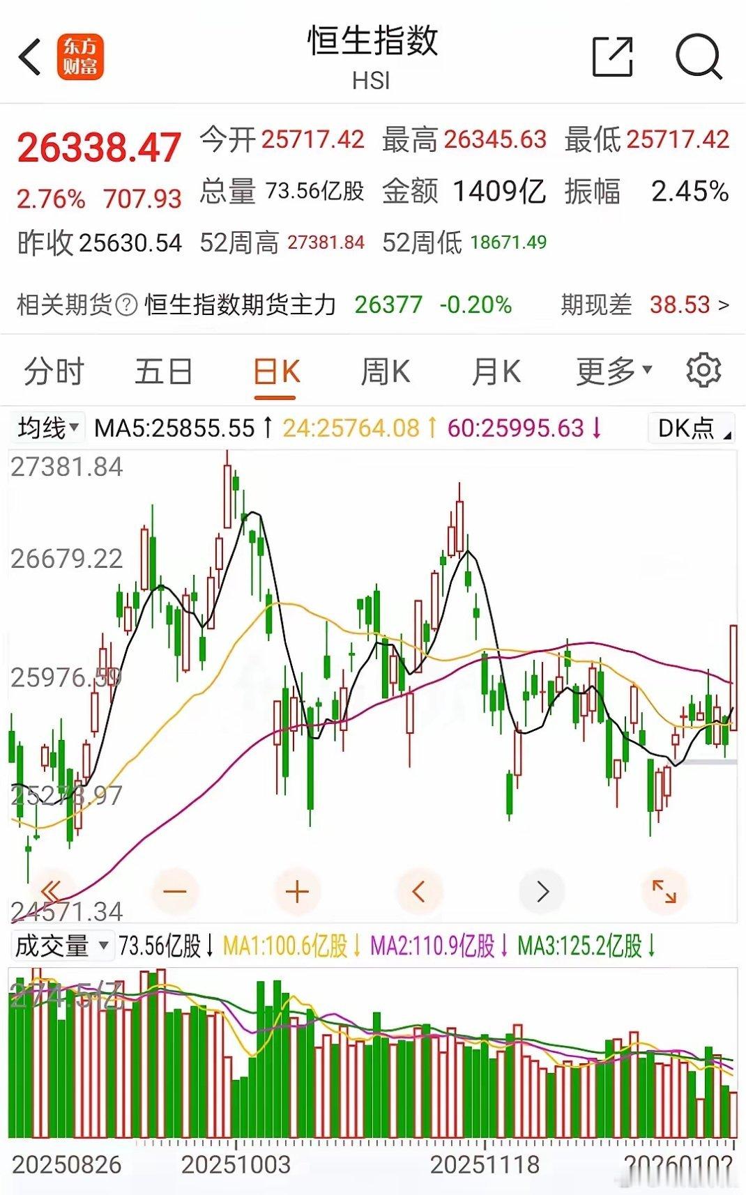 2026开年大爆发!港股开门红引领行情,A股券商或成领涨先锋2026年首个交易日,港股市场迎来近17年最强开局,恒生指数高开高走,单日大涨2.76%,收报26338.47点,日内暴涨超700点,为全年行情奠定强势基调 。盘面中金融板块表现亮眼,券商股集体走强,中信证券H股大涨4.09%,华泰证券H股涨幅更是达到4.62%,成为拉动指数上行的重要力量。与此同时,恒生科技指数同步大涨4%,半导体、互联网等多个板块协同发力,市场赚钱效应全面扩散 。作为A股的“海外风向标”,港股开年的强势表现,叠加政策红利、资金回流等多重利好共振,让市场对2026年A股开门红充满期待。从板块逻辑来看,券商板块兼具估值修复与业绩改善预期,且已有北向资金、社保基金等聪明资金提前布局,大概率将成为引领A股大盘上行的核心主线,对于重仓券商的投资者而言,无疑是值得期待的开年行情。