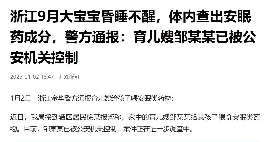 家中监控没拍到证据,育儿嫂否认喂药,家政公司称“不清楚情况”。9个月宝宝突然昏睡不醒,体内安眠药成分来源成谜。 那么,宝宝的爸爸妈妈是如何发现异常的?据媒体报道,浙江金华徐女士生育一对龙凤胎,花7600元/26天的价格请了一个育儿嫂。 育儿嫂上门一个多月,宝宝异常嗜睡,不爱吃奶,身上还长红疹。徐女士和丈夫心中疑惑。 12月30日晚上,保姆说要哄宝宝睡觉,关上了房门和灯。宝宝的爸爸不放心,走进去,发现男宝宝昏睡,怎么都唤不醒。 徐女士着急地问育儿嫂给孩子喂了什么。育儿嫂否认喂药,说自己问心无愧。 徐女士和丈夫赶紧把孩子送到医院,结果从孩子的血液和尿液中检测出了安眠药的成分——唑吡坦,一种新型镇静催眠药物。 警方接警后,已将育儿嫂控制,目前正在调查取证中。 警方通报吸引了网友们的极大关注。不少人确信是育儿嫂下的手,还来不及给女宝宝喂食,就被发现了,呼吁有关部门加大打击力度,保护宝宝们健康成长。 不过,目前还不能确定是宝宝体内药物成分的来源。 徐女士家中虽然安装了监控,但那天晚上,育儿嫂关了灯,走到房间的角落操作,监控并没有拍到异常举止。而且,育儿嫂已否认干了不法的事。 家政公司辩称小孩子有尿道畸形,本来就在吃药。这种说法混淆视听,宝宝吃的是小剂量阿司匹林,根本就不是安眠类药物。 如果真的查不到育儿嫂喂药的证据,那么法律就拿她没什么办法了吗? 当然不是。想要追究育儿嫂的刑事责任或行政责任,目前看,证据尚未达到立案的标准。 但可以先行追究育儿嫂和家政公司的民事责任。2022年上海谷维素案件就是很好的借鉴。 当年,育儿嫂史某进家门后,上海柯女士发现宝宝反常地整夜熟睡(原本每晚醒三四次),经过暗中观察,发现育儿嫂都在凌晨2点给宝宝喂水。 柯女士质问育儿嫂,并从其随身包中找出了一瓶谷维素(与宝宝体内的药物成分一致)。 育儿嫂否认喂药,说这瓶谷维素是自己吃的,质疑送检的瓶子可能受了污染,检测结果不准确、不合法。 法院经过审理认为,虽然检测过程存在瑕疵,但没有证据证明样本受到了污染。根据民事案件证据盖然性原则(即“高度可能性”),认定育儿嫂给宝宝喂食了安眠药物,应当承担民事赔偿责任。 所以,在浙江这起案件中,已有证据有孩子的异常行为和检测报告,也能排除服用药物的其他途径,足以形成高度盖然性的证据链,可以先行追究育儿嫂和家政公司的民事责任。 有关监管部门应该对对家政公司的营业许可和育儿嫂的从业资格进行再审核,如确定有违法行为,应当禁止经营、取消资格,保护宝宝们的健康成长。 你觉得,家中安装监控能防止育儿嫂不法行为吗?你身边人是否有类似的经历?欢迎到评论区分享!