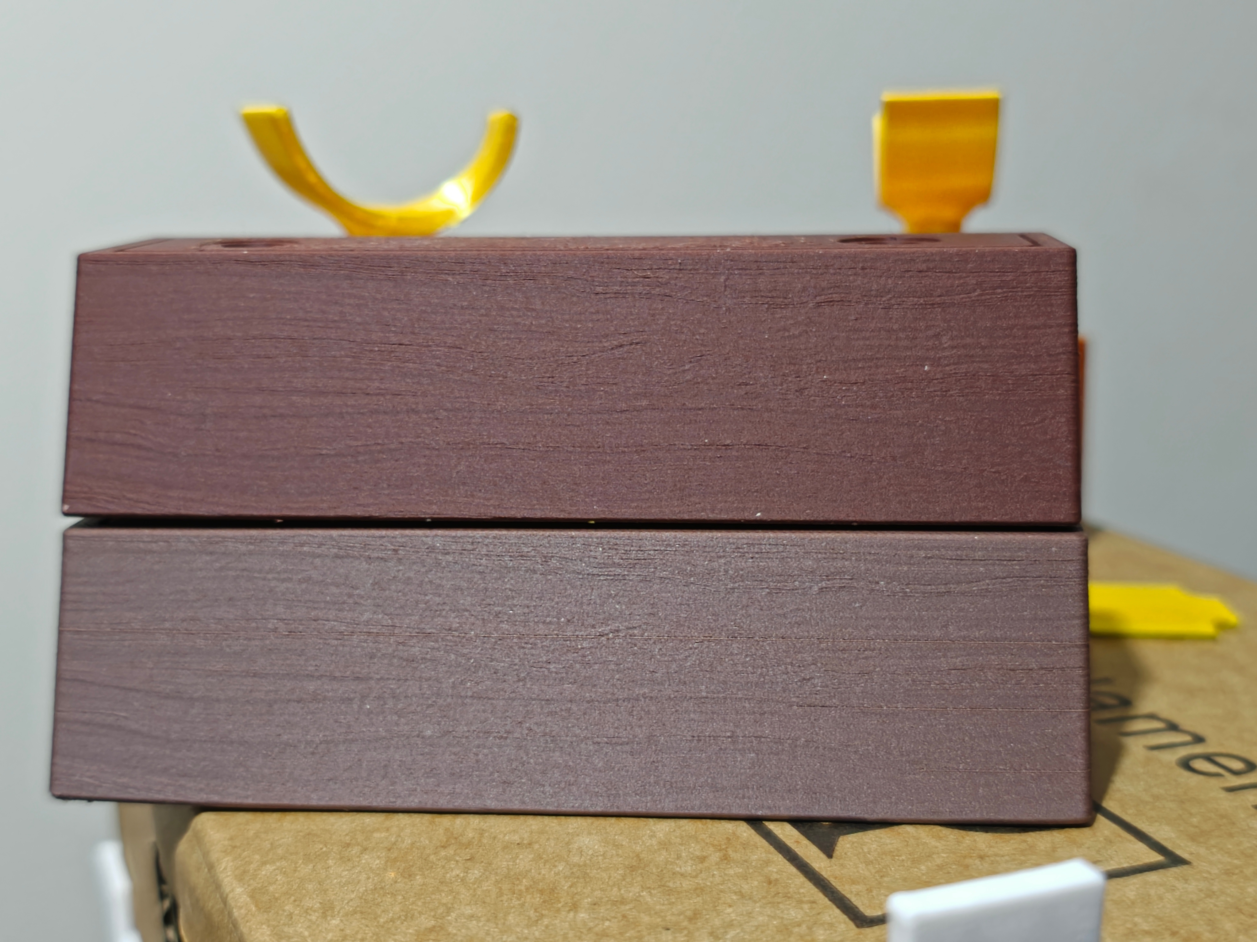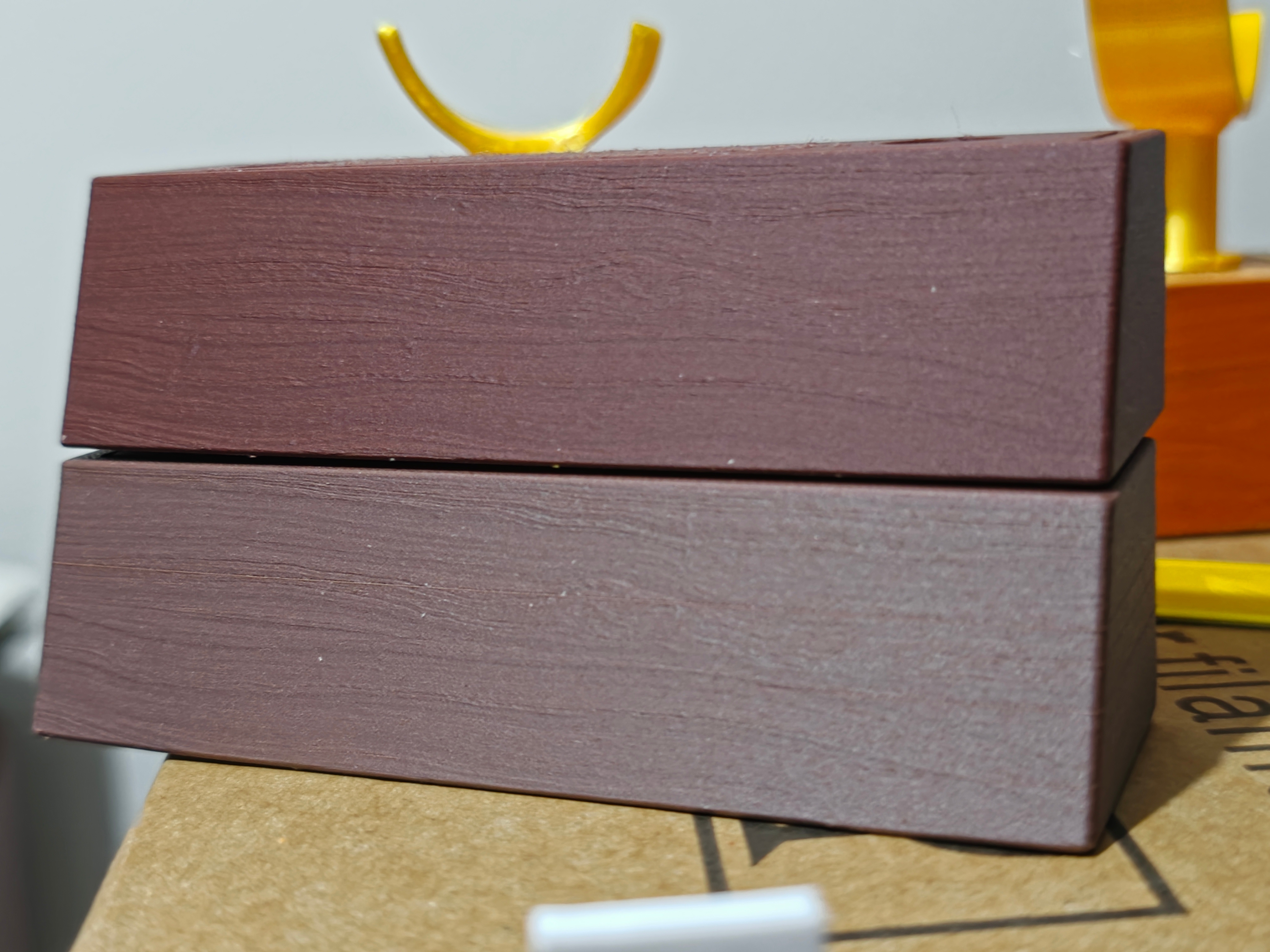 3D打印木头测试成功!萝卜录音笔大升级。此前做的底座是韧性纤维材料,已经做出了木头的纹路。也是开源网站找的木头模型和疯狂动物城2。有凹凸纹路和明暗过度。还有金灿灿的铭牌和支架。图1,图2这次测试的是用真木头3D打印。我花钱把市面上的木头方案都买来测试,终于找到效果最棒的了。图3,图4。不仅纹路更逼真,木头质感也更出色,还有木头的香味。原理是用玉米提取物做基材,加入极细的木粉,混合成耗材。打印的时候一层一层挤出来。同理,我还测试了黑胡桃木。图5图6上面的是红木 下面的是黑胡桃木。质感稍有区别,黑胡桃木亮一些,木头的气味也不一样。还有白桦木,橡木,陶土,砖块,大理石可以选择。这波是全部搞定了。代工技术升级,价格还是一样实惠。平台上卖的还不如我的第一版,价格48还得自己组装。我这一套旧款 图9 成本是14块钱。升级到图1是16块钱。升级到图2的真木头底座是24块钱。绝对找不到比我更实惠,更好效果的了。我自己已经找了一圈了。欢迎找我代工,私信就行。给爱的人留下永恒的录音吧(录音最多40秒,可以替换,不替换就能一直保留)