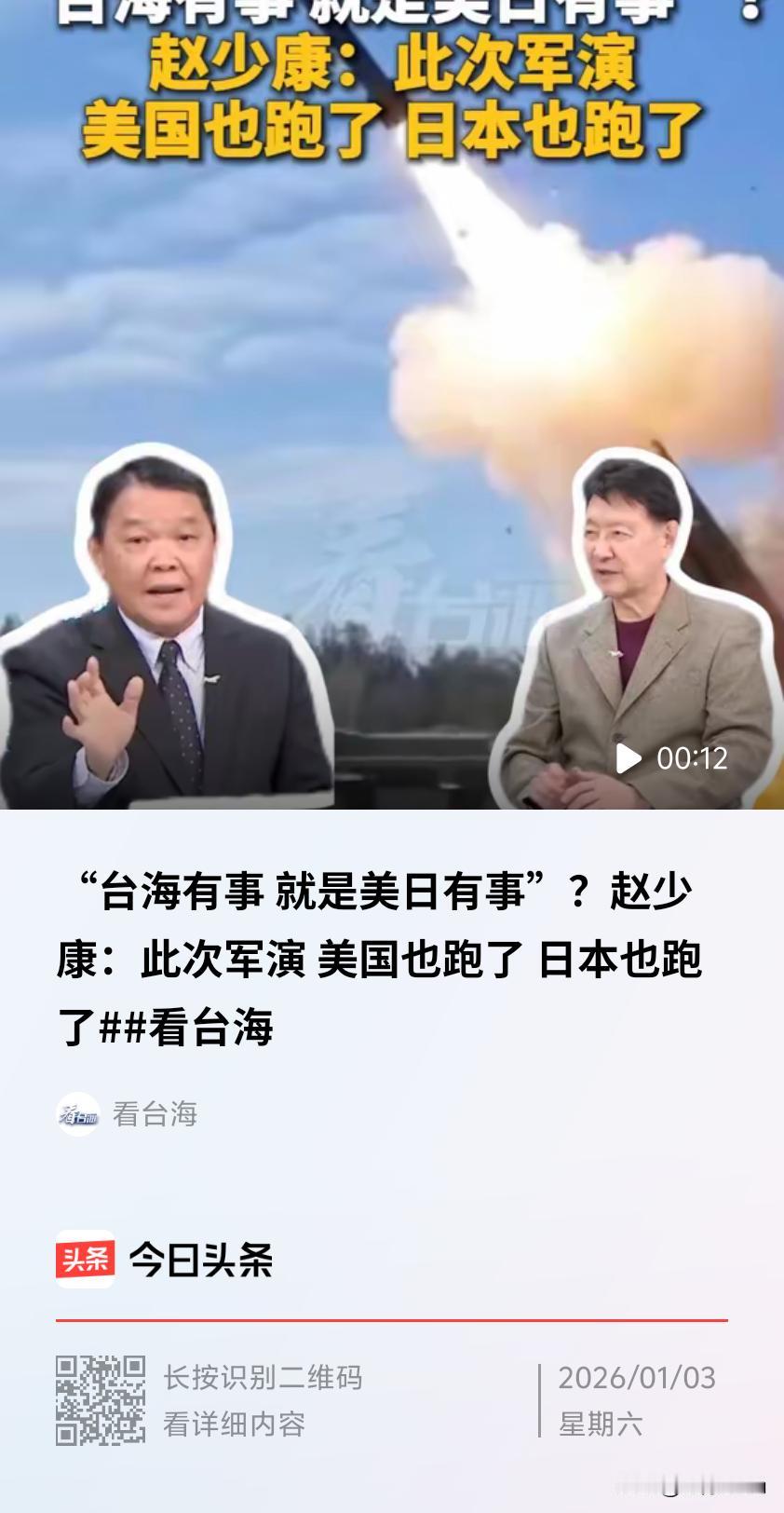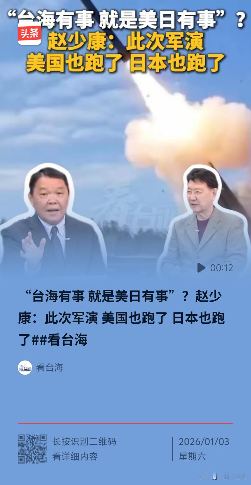 在2025年12月29日至31日解放军东部战区“正义使命 - 2025”围台军演期间,台岛名嘴赵少康在专访台前海军舰长黄征辉节目中提到,日本直到当时才有相关消息发布,此前宣称“台海有事就是日本有事”,但台海真有事时,日本跑了,美国也跑了。 军演前美日姿态强硬,美军部署双航母及两栖攻击舰,日本首相高市早苗频频放话。然而军演开始后,美军“跑路”,“林肯”号撤离、“华盛顿”号泊港未动,第7舰队撤空中侦察力量,航母在外线观望;日本退缩,高市早苗“失声”,海自、空自主力北调,西南军事力量空虚。 美日退避本质是实力格局变迁结果,也让台岛民众意识到外部撑腰靠不住。据台岛民调,68%民众认为赖清德派系搞独立会带来战争,63.9%民众不愿上战场。此次军演战略目的已达成,彰显了中方维护国家主权和领土完整、挫败外部干涉的决心与能力,也警示“台独”和外部干涉势力,祖国统一大势不可阻挡。