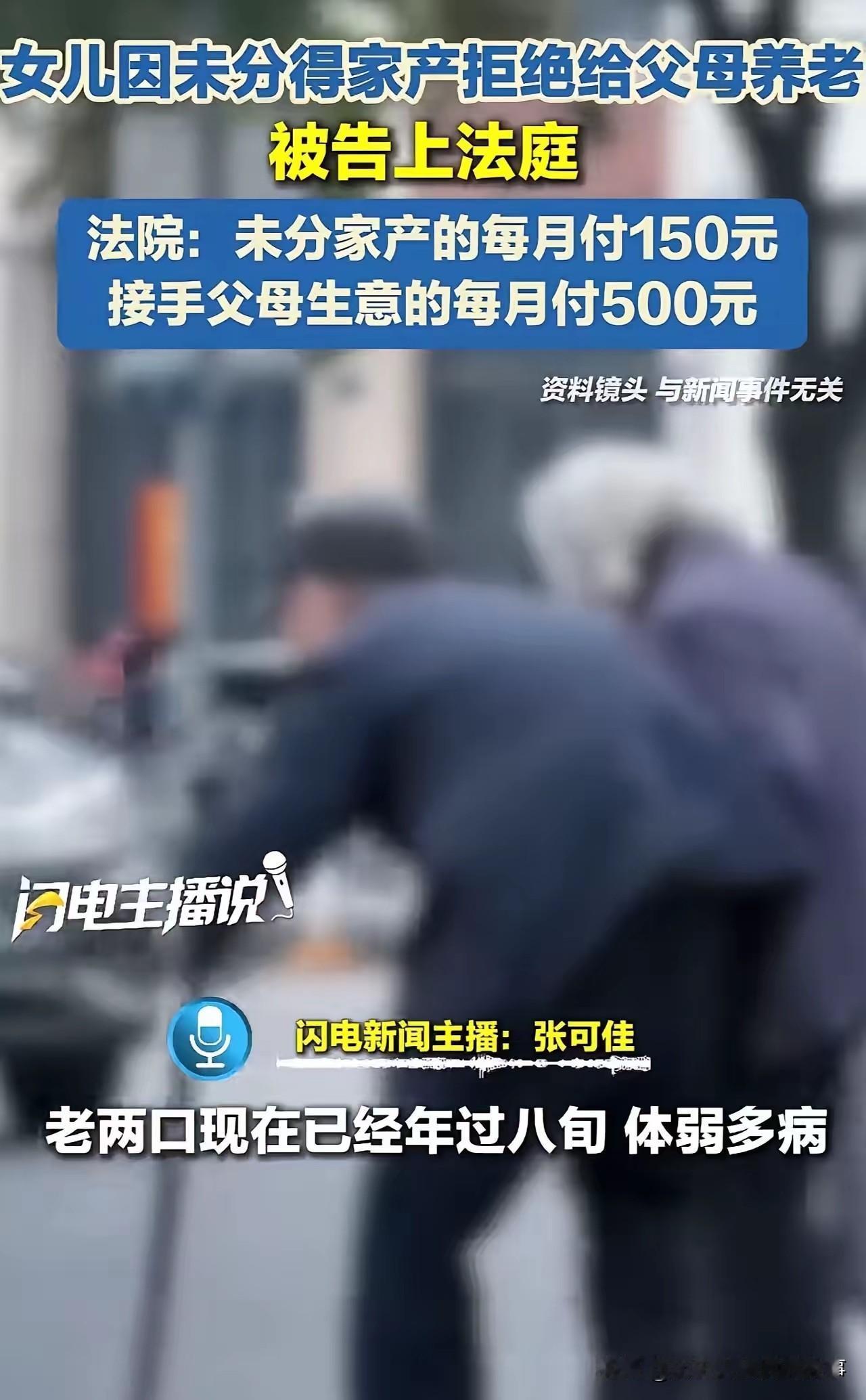 镇江句容八旬老两口,把3个女儿告上法庭要赡养费!大女儿、三女儿怒怼:出嫁没分一分家产,凭啥养老? 二女儿招婿上门吞了家里生意,还想平摊责任,法院最终判决一出,网友直接炸锅! 老两口育3女,大女三女早年出嫁,家产全留给招婿上门的二女,生意也全权移交,老两口还帮二女带大孩子。如今老父脑梗+糖尿病+脑萎缩,每月仅200多养老金,治病生活全靠借,找女儿们商量养老,二女想三姐妹平摊,大女三女直接翻脸拒付! 法庭上俩女儿委屈哭:从小到大父母眼里只有妹妹,嫁妆没给,家产没份,现在老了才想起我们是女儿?财产给谁谁养老,天经地义! ✅法院硬核判决(全网叫好!) ✅二女儿(分家产+接生意):每月各给二老500元生活费,医疗费担50% ✅大女三女(未分财产):每月各给150元,医疗费各担25% 法官一句话定音:赡养是法定义务!不分家产、是否出嫁,都不能免!但多分财产,必须多担责! 💥网友炸锅两极吵 ✅挺判决:生养之恩大于天,法律底线不能破!没分家产少拿,多分多担,太公平! ✅疼女儿:父母偏心在先,把女儿当外人,换谁心里不膈应? ✅骂二女:占尽便宜还想甩锅,良心被狗吃了! 📌法律划重点(必看!) 《民法典》明文规定:成年子女赡养义务法定强制,不得以放弃继承权/未分财产为由拒养!家产分配只影响赡养比例,不影响必须赡养的义务! 👉这事你站谁?评论区吵起来 素材来源于网络