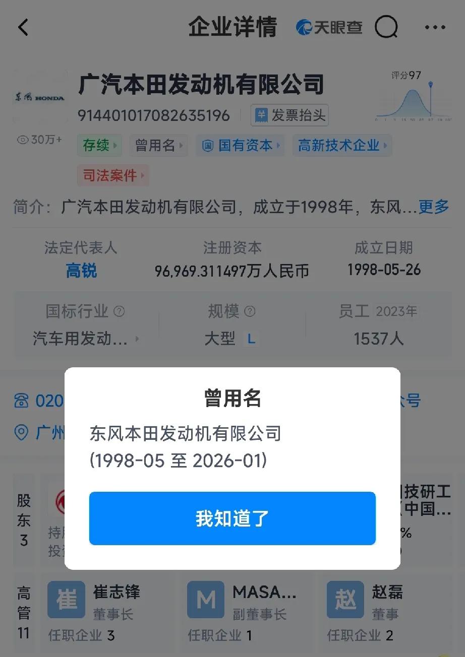 东风本田发动机有限公司已经更名广汽本田发动机有限公司,天眼查是这么显示的。不过大股东还没有更新过来,可能后续事情还没有交割完成,也可能是天眼查没有更新完毕?反正已经不属于东风了。 自东本发动机公司卖给广汽以后,东风和本田还有两家合资公司,分别是位于武汉的东风本田汽车有限公司以及位于惠州的东风本田零部件有限公司。
