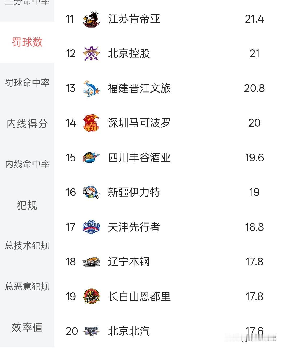 CBA场均罚球数,吉林队和辽宁队都是垫底的水平,这两支球队场均17.8次罚球排名倒数第二,和第一名相差10次罚球,这也是两队战绩下滑的原因之一,篮球比赛没有突破就很难有罚球,全是中远距离投篮,完全靠手感。
