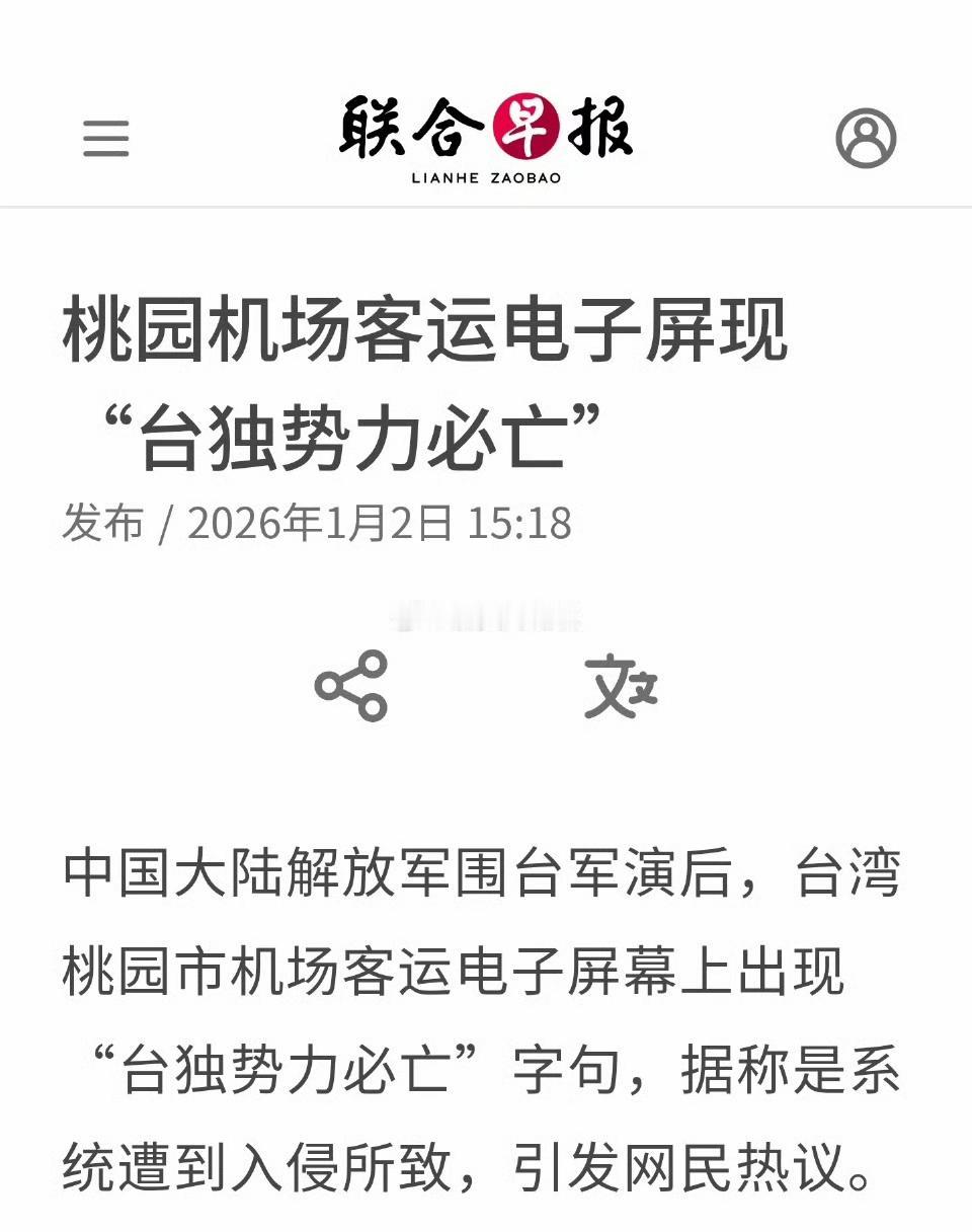 2025年12月31日,在解放军围台军演当日,有当地乘客发现,桃园机场巴士的电子显示屏上,出现“台独势力必亡,翘首以盼待回归”等字句,被人传到网上,引发讨论。有人说是黑客入侵,说是我们在远程操控。我个人认为如果此事属实的话,不会是我们干的,我们还不愿意用这么low的且没什么实际效果的小手段。在民进党八年来一系列操控之下,在他们卖台求荣、中饱私囊的骚操作下,台湾人的生活比起当年对大陆高高在上的优越感,已经一落千丈,让岛内不满现状的人越来越多,大家自发地找宣泄口来宣泄情绪。今后这样的情况只会越来越多,不信等着瞧。
