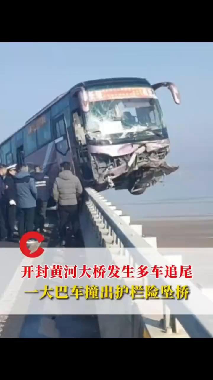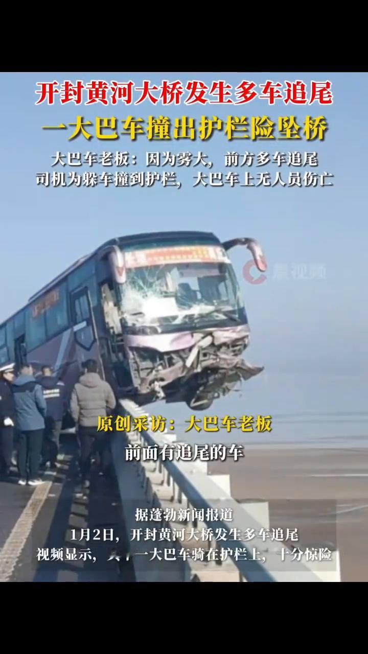开封黄河大桥发生多车追尾,一大巴车撞出护栏险坠桥。 大巴车老板:因为雾大,前方多车追尾,司机为躲车撞到护栏,大巴车上无人员伤亡。 据蓬勃新闻报道,1月2日,开封黄河大桥发生多车追尾。视频显示,其中一大巴车骑在护栏上,十分惊险。 原创采访:大巴车老板。 前面有追尾的车,(司机)躲车了。大巴车老板表示,当时因为雾大,前方多车追尾,司机为躲车撞到护栏,大巴车无人员伤亡。目前,事故具体原因有待官方通报。