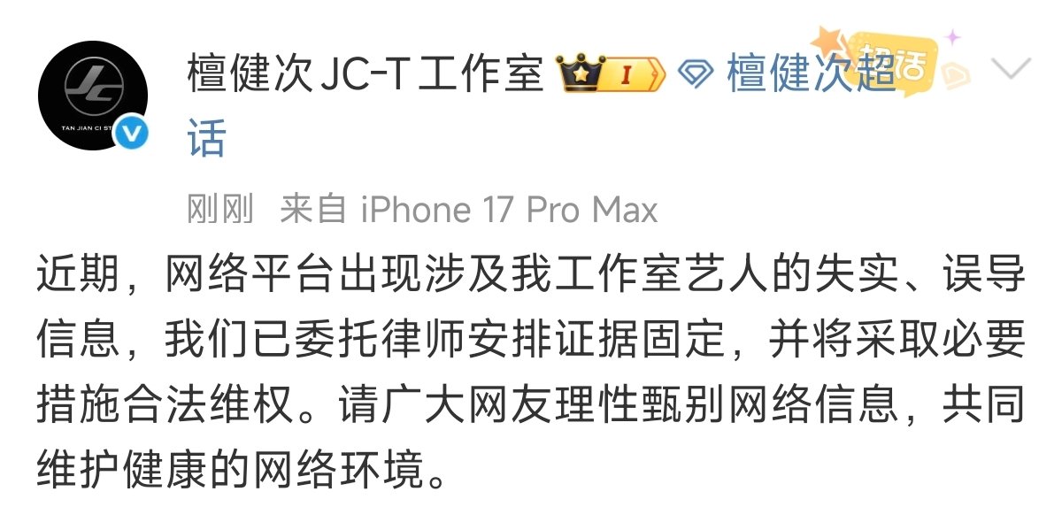 檀健次工作室辟谣聊天记录檀健次工作室辟谣檀健次工作室辟谣了,已委托律师安排证据固定,并将采取必要措施合法维权。请广大网友理性甄别网络信息,共同维护健康的网络环境。 疑似檀健次司晓迪聊天记录