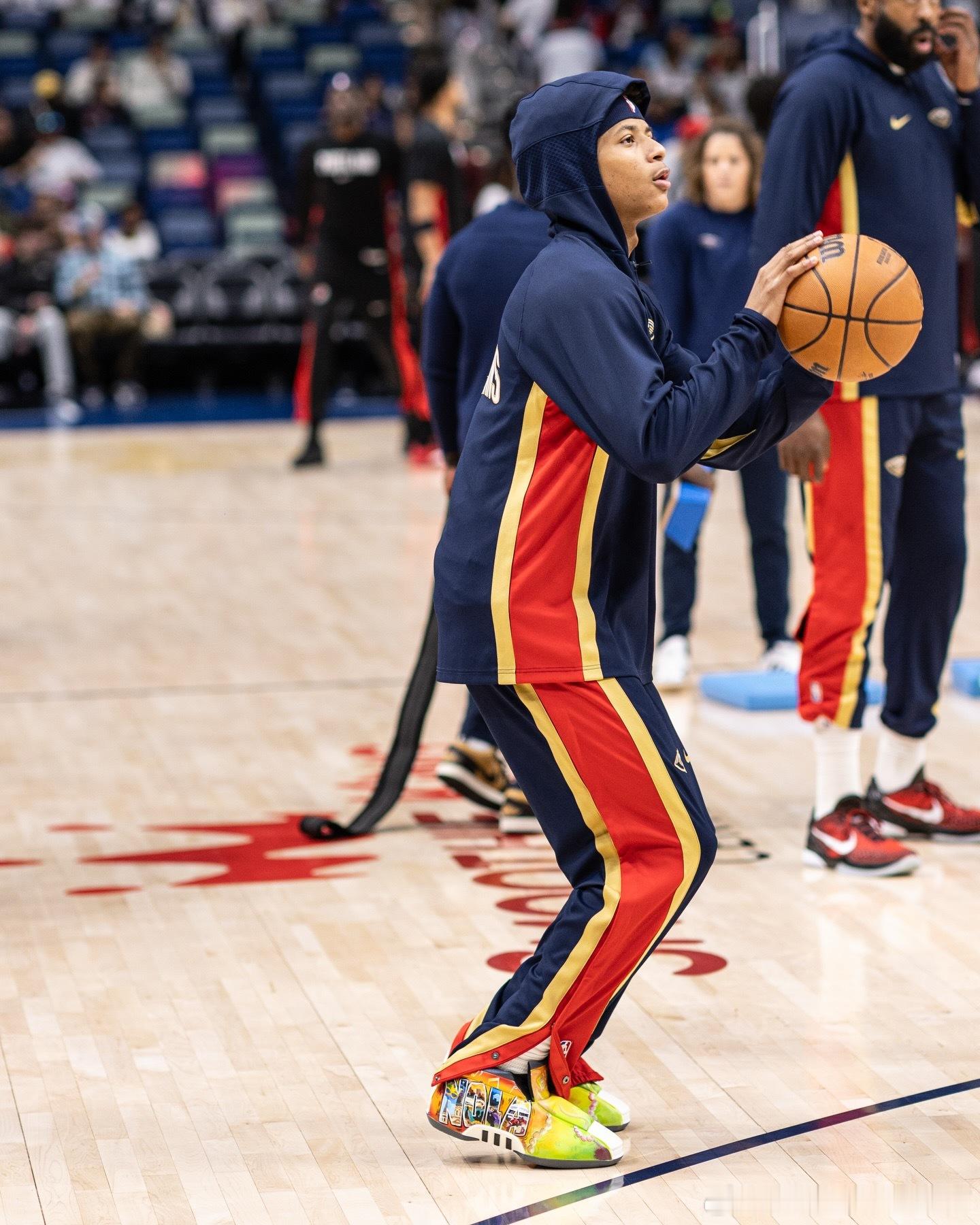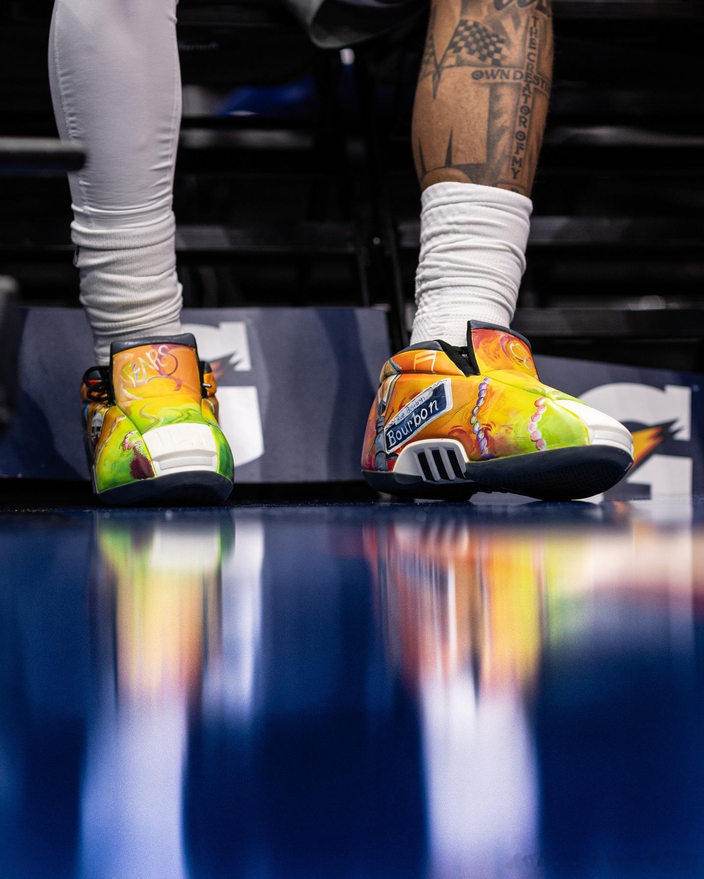 杰里迈亚费尔斯 费尔斯吉今天上脚adidas T-Mac 3的定制彩绘配色,主题围绕Bourbon(波旁酒)和新奥尔良城市文化打造的专属PE(Player Exclusive)