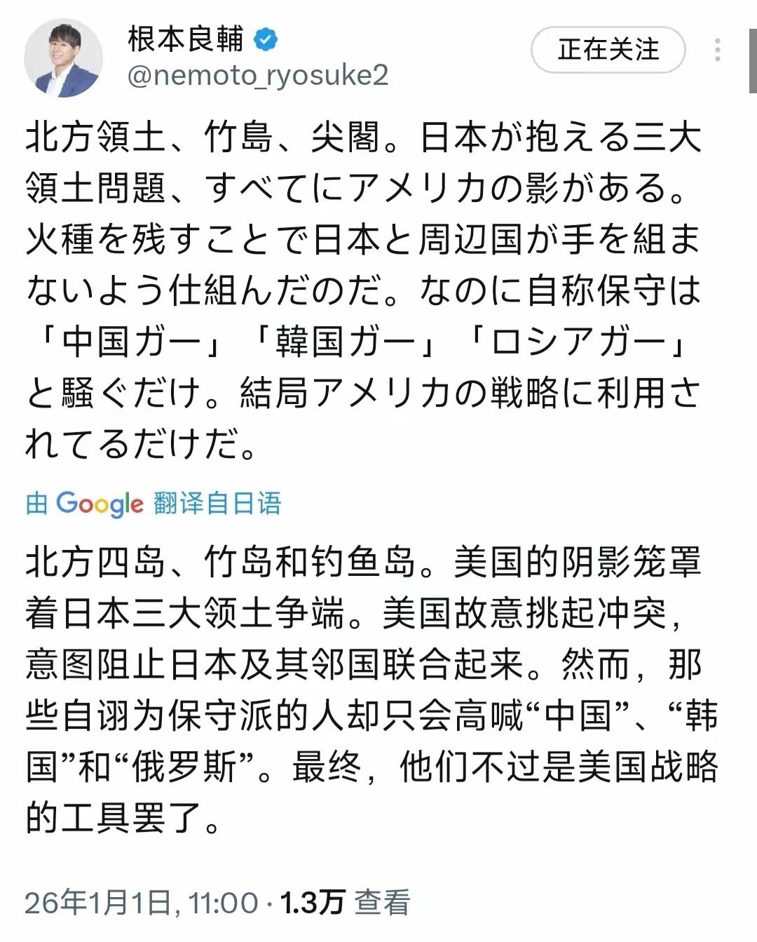 日本政治团集“翼之党”干事长根本良辅1月1日发文写道:“北方四岛、竹岛、和钓鱼岛。美国的阴影笼罩着日本三大领土争端。美国故意挑起冲突,意图阻止日本及邻国联合起来。然而,那些自诩为保守派的人只会喊着“中国”“韩国””俄罗斯”。最终,他们不过是美国的战略工具罢了。” 根本良辅这言论算是在日本比较清醒的政客,美国挑起地区矛盾升级来实现自己的地缘政治利益,正所谓“对我有所求、为我所用”,这一直以来都是美国对外惯用的外交手段。 其实,日本若不想被美国永久拿捏,本应该保持中立,让美国去跟其他相关方缠斗。若日本右翼分子反而想利用挑衅区域矛盾升级达到重走军国主义发展道路,这无疑是在玩火,只会遭到迎头痛击,把日本带入一条不归路。