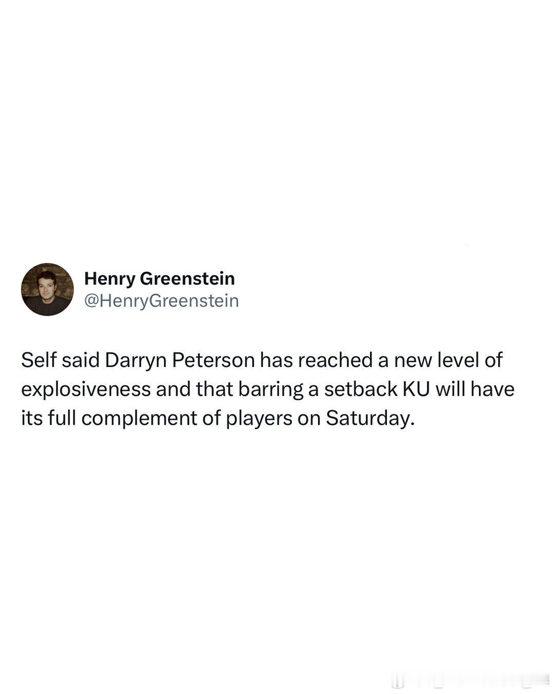 据堪萨斯大学主帅比尔·塞尔夫透露,达林·彼得森(Darryn Peterson)预计将在本周六对阵中佛罗里达大学的比赛中伤愈复出这位大一后卫本赛季仅出战四场比赛
