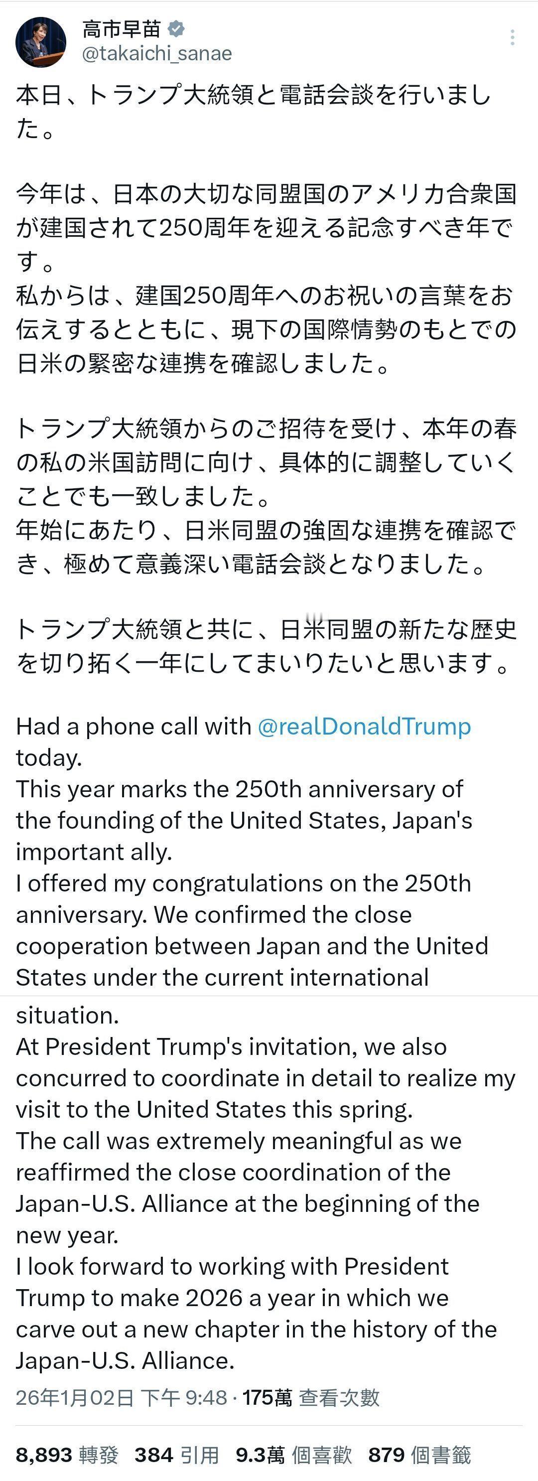 高市又开始炫耀了! 高市早苗发推说: “很高兴与特朗普前总统进行了通话。我们就在自由开放的印度-太平洋地区紧密合作一事达成一致,并对深化日美同盟、为地区和平与稳定开辟新篇章的必要性拥有共同看法。 “特朗普前总统再次主动邀请我访问美国。我们已达成一致,将就具体细节进行协调,以期实现我于今年春季的访美行程。 “能与这位美国下任总统最有力的竞争者建立如此牢固的信任关系,是我的荣幸。我将在这一坚实基础上,为日本的利益以及世界的和平与繁荣而继续努力。” 【说两句】作为日本首相,去美国“述职”是这个岗位的职责内容之一,是一定会去的。以特朗普out-going和show-off的个性,他碰到谁应该都会说,“改天,来我家玩啊,来我家玩啊”。但若当他是真心邀请,那就太不懂人情世故了吧。去,是迟早的事,但不能对特朗普造成负面影响。 而且这句话:“…concurred to coordinate in detail to realize my visit to the United States this spring”,同意协调,就是“创造条件”的意思。 其实也不需要过多分析,以高市高调张扬的个性,要是美方已经确定她赴美,她就不会这语气,而是直接宣布访美日程了,所以她得到只是“half yes”,意思就是: “好的,再约!” Source: X