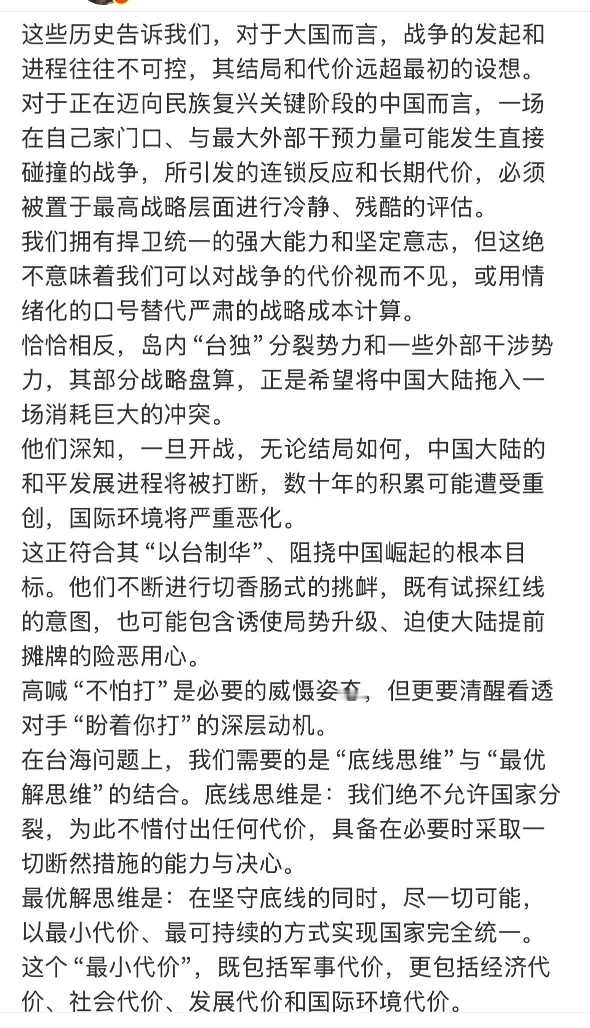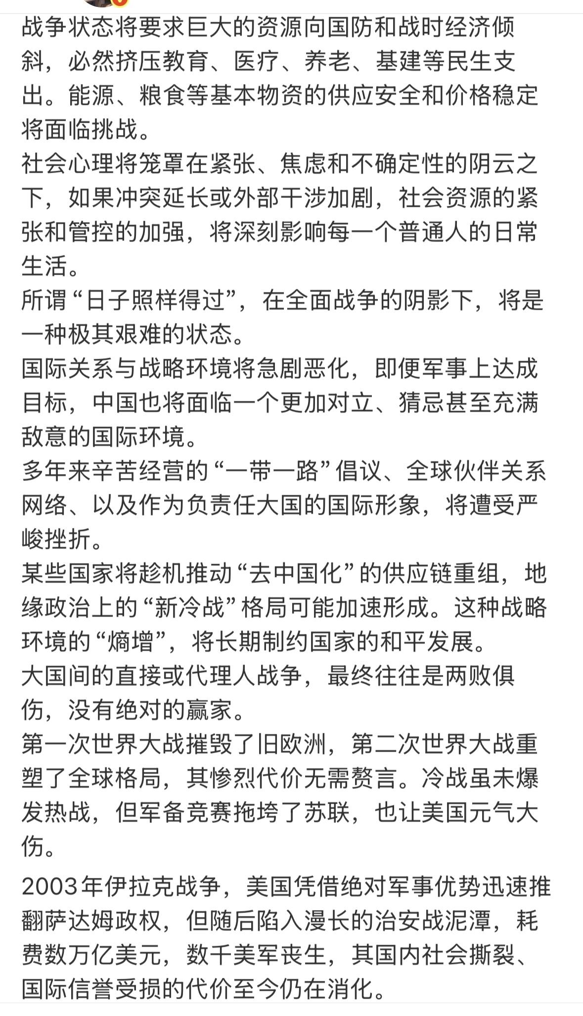 看了文章和评论,文章观点是,不能打仗,打招呼将付出沉重代价,甚至几代人都承受不起的代价。但是,很多人认为必须打一仗,打仗才能振兴中华,把敌人都消灭了,我们就能独霸世界。你觉得,这一仗该不该打?
