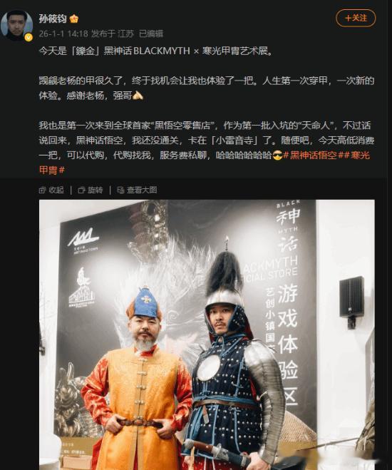 知名影星晒照黑神话甲胄展:人生第一次穿甲超激动2026年新年第一天,《黑神话》与寒光甲胄等联合举办“中国甲胄艺术展”。现场将包含甲胄静态展示、体验试穿、NPC定点互动、甲胄巡游等多个项目。国内知名演员孙筱钧(《八佰》《新世界》)参加了这次活动,并在社媒分享了许多现场图片。他写道:“今天是「鑠金」黑神话BLACKMYTH × 寒光甲胄艺术展。觊觎老杨的甲很久了,终于找机会让我也体验了一把。人生第一次穿甲,一次新的体验。我也是第一次来到全球首家“黑悟空零售店”,作为第一批入坑的“天命人”,不过话说回来,黑神话悟空,我还没通关,卡在「小雷音寺」了。”