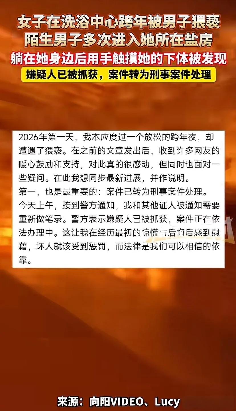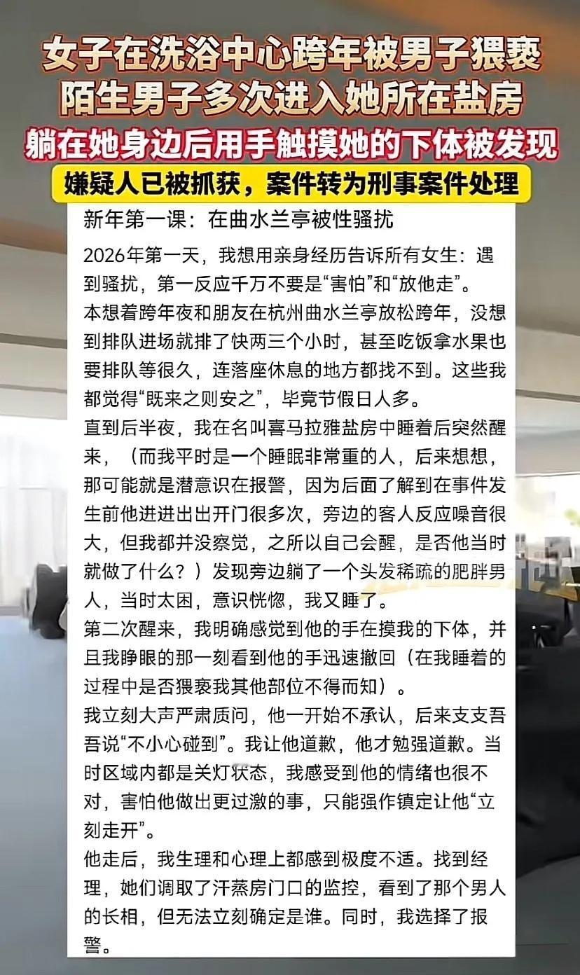 跨年夜在近千元的洗浴中心汗蒸房睡着,醒来竟发现被陌生男子摸私处…… 杭州一位女子和朋友的跨年计划,选在了一家高端洗浴中心。没想到从排队进场到找位置休息,处处是人。熬到半夜,她在汗蒸房里实在困得不行,迷迷糊糊睡着了。 第一次醒来时,她隐约看见旁边躺着一个头发稀疏、身材肥胖的陌生男人,但困意太重,没多想又睡了。 可第二次醒来时,她清楚感觉到有人在摸她的下体——正是刚才那个男人! 女子又羞又气,立刻大声质问。对方支支吾吾,先说“是不小心碰到的”。女子强压怒火让他道歉,察觉对方情绪不太对劲,怕激化危险,便先让他离开。随后她马上找到洗浴中心经理调取监控,并果断报警。目前,涉事男子已被警方刑事拘留。 那么从法律上怎么看这件事? 1. 该男子的行为已远不是“耍流氓”,而是涉嫌 强制猥亵罪。根据《刑法》第237条,以其他方法强制猥亵他人,可处五年以下有期徒刑或拘役。他趁女子熟睡不知反抗时实施侵犯,情节恶劣。 2. 女子除了报警追究其刑责,还可以依据《民法典》第1010条,要求男子承担民事赔偿责任,包括精神损害赔偿。 3. 洗浴中心也未必能完全撇清责任!根据《民法典》第1198条,经营场所经营者对消费者负有安全保障义务。女子支付了近千元费用,商家应提供相应的安全环境。若因巡查不足、监控不到位等给不法分子可乘之机,洗浴中心需承担相应的补充责任。 很多网友问:这么贵的地方,安全怎么还没保障? 事实上,收费越高,商家应尽的安全保障责任就越重。此案也提醒大家:在公共场所休息务必保持警惕,尤其是夜间或单独一人时。但若不慎遭遇侵害,请一定冷静保留证据、及时报警——法律永远是受害者最坚实的后盾。 本文依据《中华人民共和国刑法》《中华人民共和国民法典》及相关司法实践进行解读,案例素材来源于社会新闻报道。 对此你怎么看?你觉得洗浴中心该为此负责吗?欢迎留言讨论!