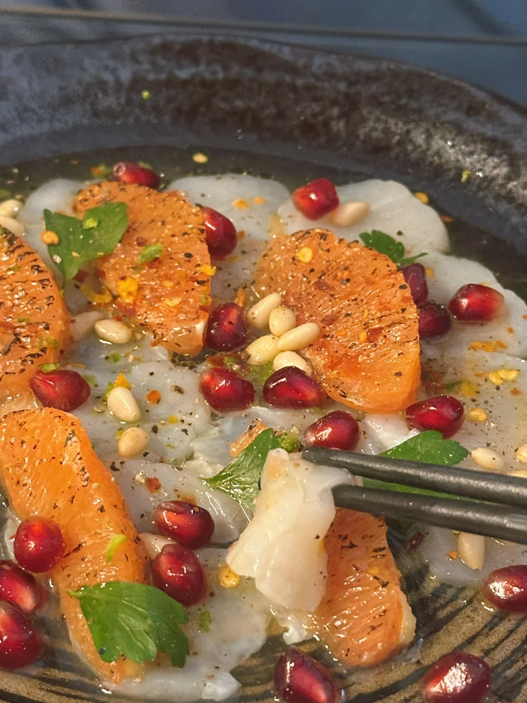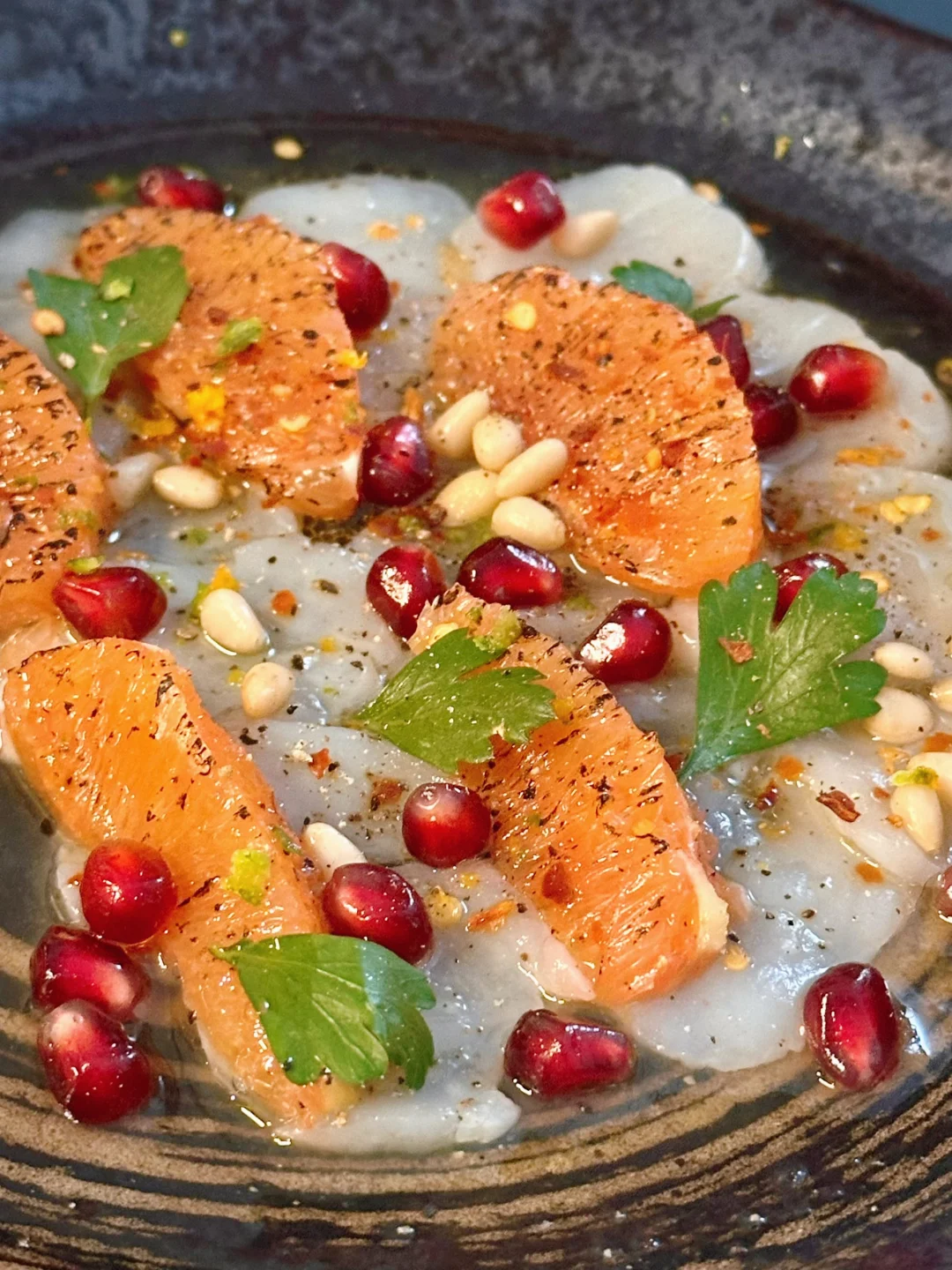 🐚回到家后,赶快洗手换衣服,我也来做个小前菜:扇贝carpaccio。经典的柑橘风味,但因为是冬天,特意喷枪烤了粉橙肉,再撒了坚果和石榴籽。我愿称之为,西西里的冬天。