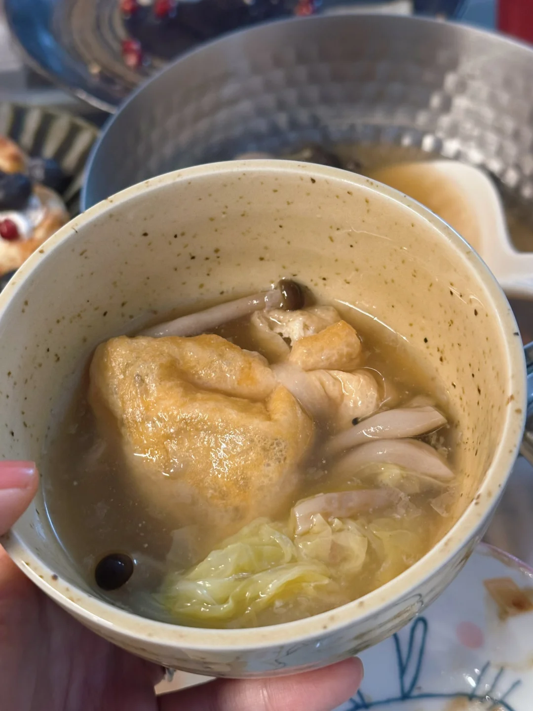 🥬男友还做了糖醋彩椒,我隔天烤了迷你肉桂卷,用关东煮福袋煮了个汤。我不小心把一个福袋煮散了,男友打圆场说:“这意味着你福气爆棚了!”