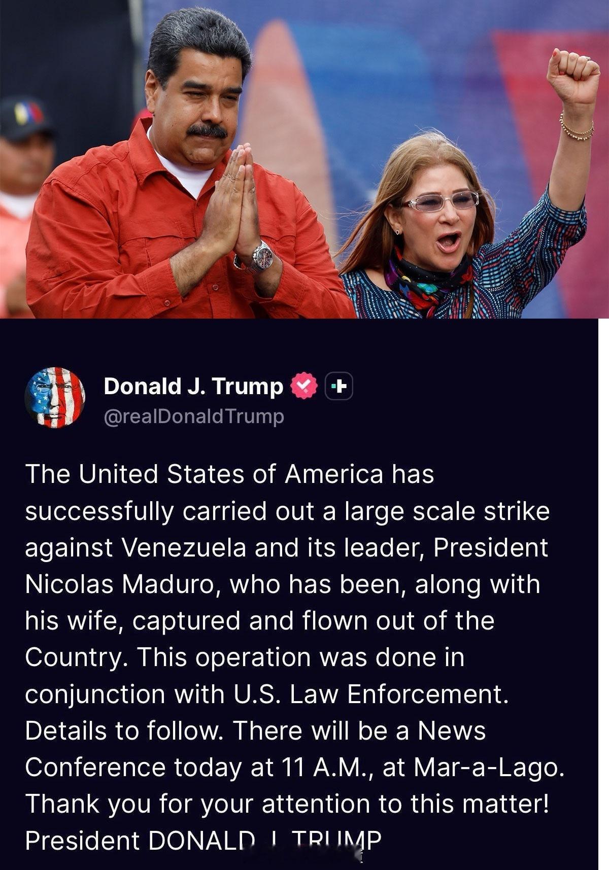 【特朗普宣布俘虏了委内瑞拉总统尼古拉斯·马杜罗和他的妻子】委内瑞拉局势最新重大更新(2026年1月3日):根据美国总统唐纳德·特朗普本人在Truth Social上的声明,以及多家主流媒体的实时报道:🚨特朗普宣布:美国成功对委内瑞拉进行了“大规模打击”(large scale strike),并在行动中俘虏了委内瑞拉总统尼古拉斯·马杜罗(Nicolás Maduro)及其妻子,两人已被“运出该国”(captured and flown out of the country)。👉委内瑞拉总统尼古拉斯·马杜罗的妻子叫西莉亚·弗洛雷斯(Cilia Flores),全名为西莉亚·阿德拉·弗洛雷斯·德·马杜罗(Cilia Adela Flores de Maduro)。👉特朗普表示,此行动与美国执法部门合作进行,并将于今日上午11时(美国东部时间)在Mar-a-Lago举行新闻发布会,提供更多细节。🚨• 《纽约时报》直播更新:特朗普在社交媒体上宣布美国俘虏了马杜罗及其妻子,并将他们运出委内瑞拉。• CBS News:特朗普确认美国进行了大规模打击,并俘虏了马杜罗夫妇。• 《卫报》、路透社、Al Jazeera、Bloomberg等均报道了特朗普的这一声明。• X平台上大量实时帖子(包括OSINT账号和新闻机构)转发了特朗普的原话和相关截图。
