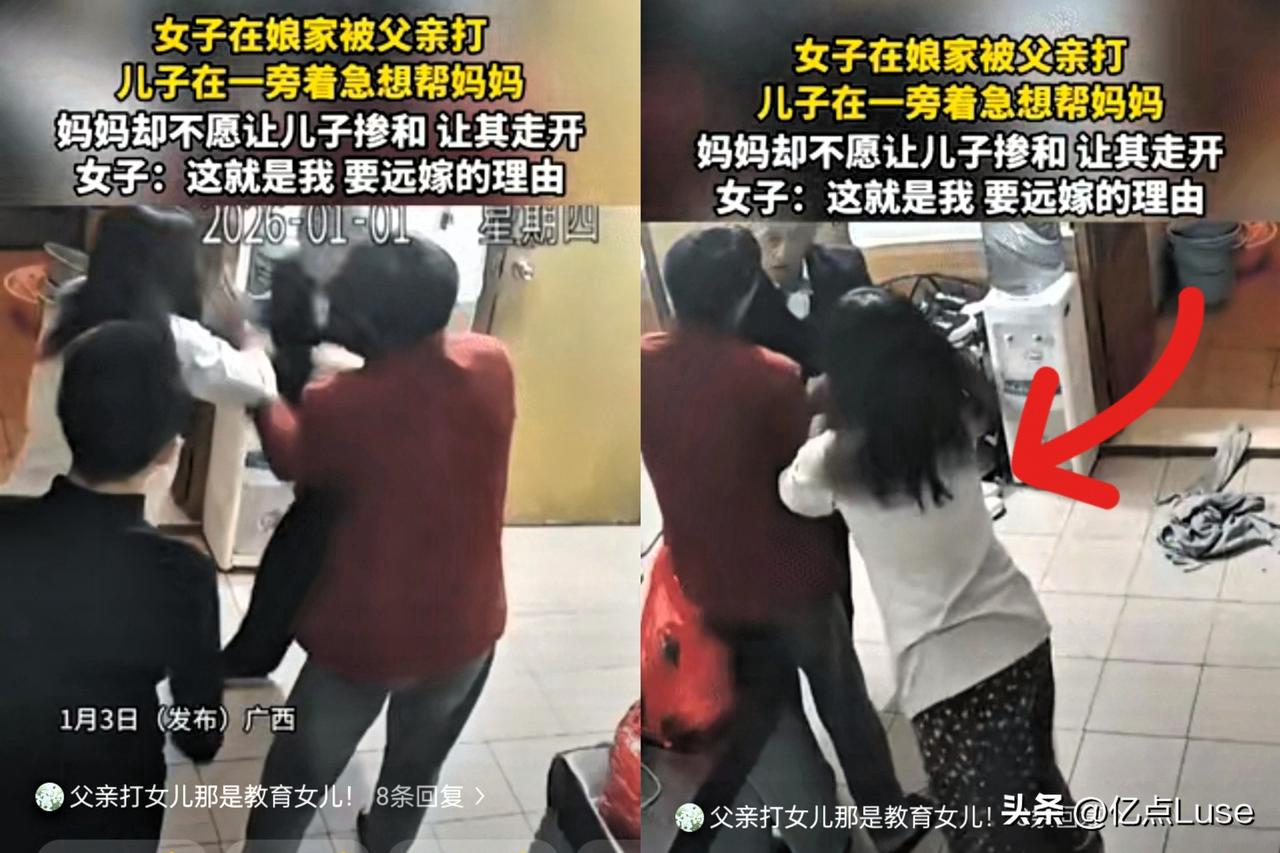 彻底乱套了!广西一女子回娘家,与父亲发生矛盾,父亲情绪激动欲动手打她。拉扯间,女子儿子见状着急上前帮母亲,女子却用身体挡住儿子,劝他离远点,不想让他掺和。网友称:“儿子可拉架,不能参与打架”。 视频显示,女子带儿子回娘家探亲,在客厅不知为何与父亲争吵,老人情绪激动想动手,被女子和母亲死死抓住。 不料,里屋的儿子听到动静出来,见姥爷要打母亲,立刻上前指着姥爷,想帮母亲动手。 女子怕事情闹大,一边紧紧抓住父亲,一边用身体挡住儿子,不让他动手,还一直劝儿子离远些。 视频上网后,网友看法不一。 有网友认为,此后姥爷和外孙亲情或就此终结,女儿与父亲的亲情还有修复可能。 也有网友称,孩子可护母,但绝不能打姥爷,毕竟那是长辈。 老话说“百善孝为先”,此事对错参半。若儿子对老子动手,女子没毛病;若儿子想对爷爷或姥爷动手,那孩子父母就太失败,孩子和父母都该挨批。 总体而言,女儿有孝心,不让儿子打外公;儿子也有孝心,不让外公打母亲。 但不论事情缘由,孩子指着姥爷还想动手,实在大逆不道。爱母没错,可那是长辈,更是母亲的父亲!