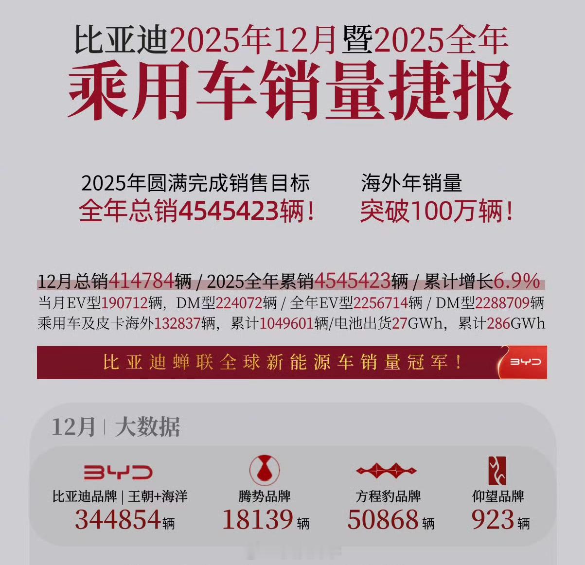 特斯拉2025年全球交付汽车163.6万辆,同比下降约8.6%。比亚迪2025年乘用车总销4545423辆,海外销量就突破了100万辆,纯电车型225.7万辆。这也代表着,比亚迪的纯电车型销量都已经超远超特斯拉了。特斯拉比亚迪