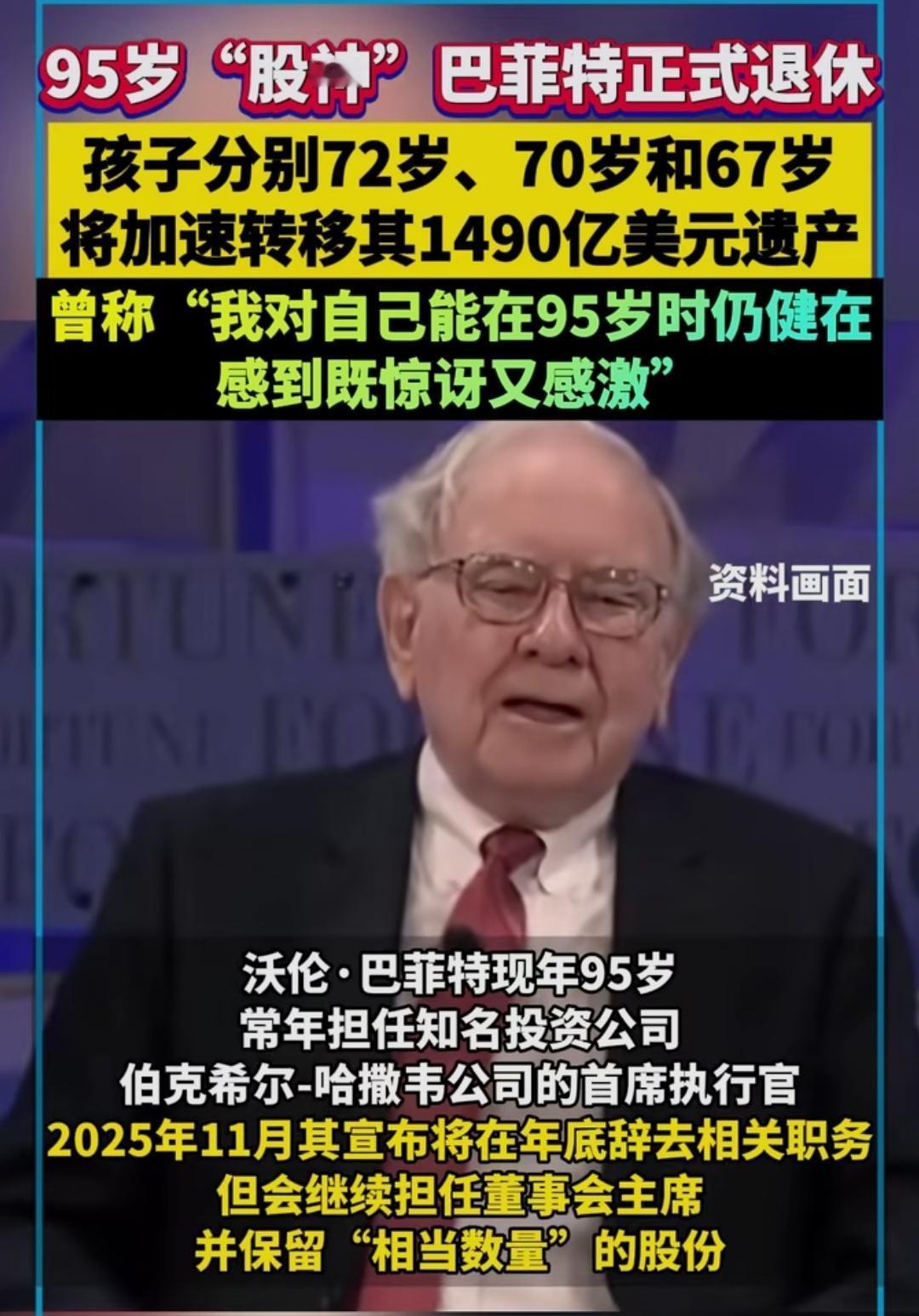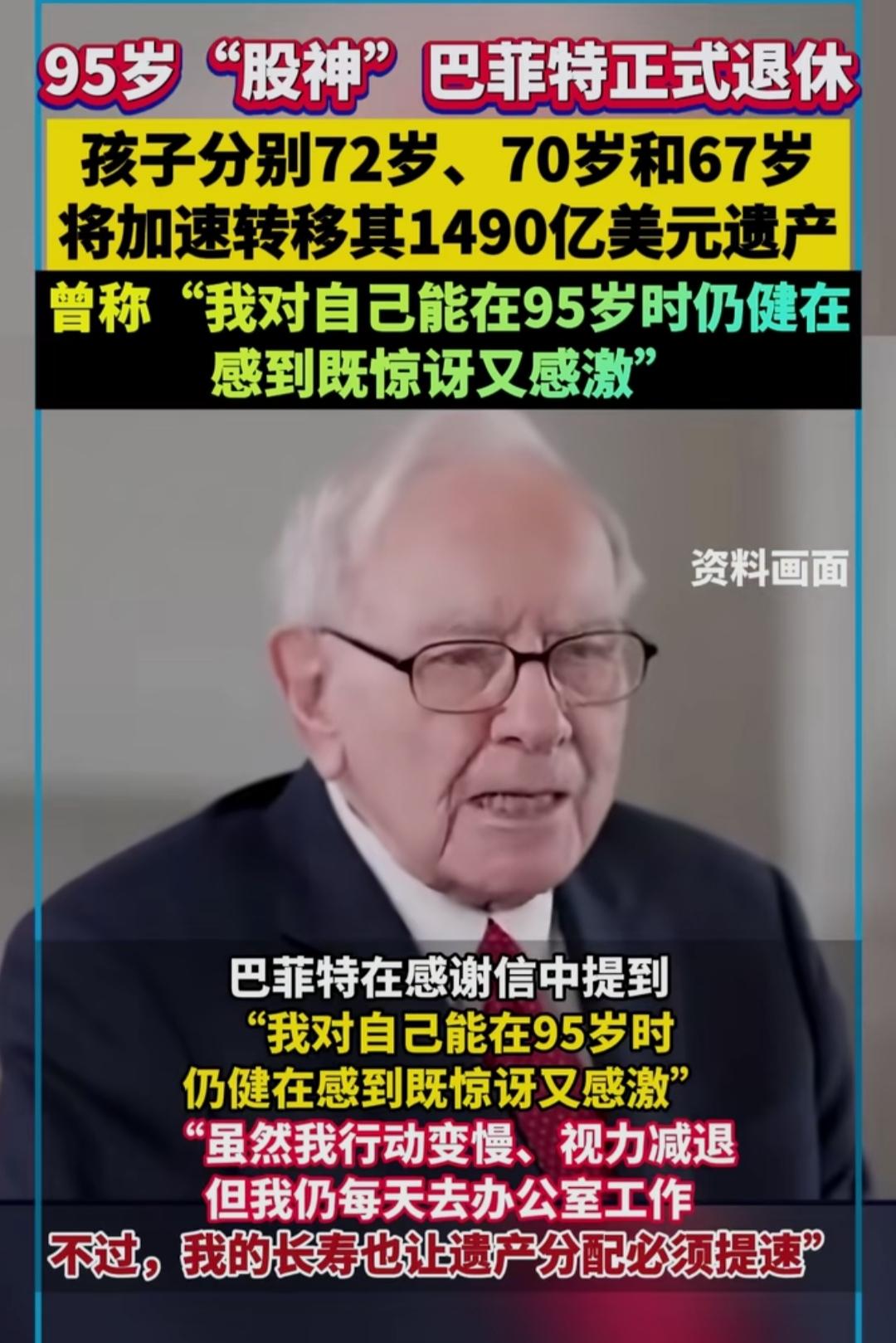 2025年最后一天,95岁的“股神”巴菲特官宣退休,结束了长达60年的伯克希尔管理生涯。这个消息一出来,无数人感慨:一个时代真的落幕了。毕竟他可是投资界的“活神话”,从白手起家到执掌千亿商业帝国,一辈子在资本市场翻云覆雨,如今终于卸下了重担。 可比起退休本身,更让人佩服的是他的清醒。95岁高龄不仅没执着于权力不放,还主动加速分配1490亿美元遗产,一半捐赠慈善,一半留给子女基金会,既守住了社会责任,也兼顾了家人。他坦言自己长寿“既惊讶又感激”,趁着精力尚可做好交接,这份通透远超常人。 60年里,巴菲特靠价值投资赚得盆满钵满,但真正的传奇从不是财富多少,而是他始终保持的敬畏与清醒。不恋权、不贪财,在合适的年纪做合适的事,既对公司负责,也对家人和社会尽责。原来最高级的人生,从来不是一直冲锋,而是懂得何时坚守、何时退场。