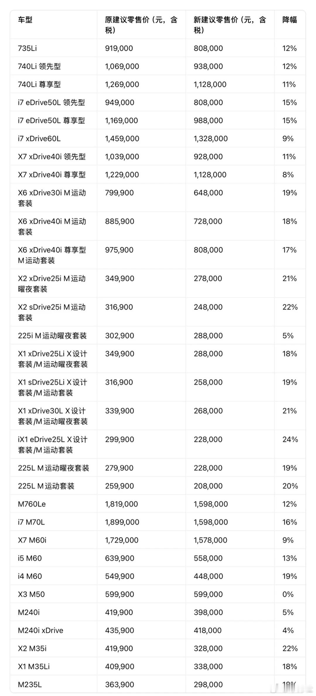 【最高降价30万!宝马回应】1月1日,宝马中国对旗下多款主力车型进行调价,车型涉及轿车、SUV、电动以及高性能等,部分车型至高下调30余万元。其中,旗舰车型i7 M70L指导价由189.9万元降至159.8万元起,直降30.1万元;宝马行政级轿车7系入门版735Li指导价由91.9万元降至80.8万元;740Li领先型由106.9万降至93.8万元。降幅最高的是宝马iX1 eDrive25L,指导价由29.99万降至22.8万元,降幅为24%;燃油版的X1也同步调价,X1 xDrive25Li指导价由34.99万降至28.88万元;X1 sDrive25Li由31.69万降至25.8万元。另外,包括X2、i4、i5、X6等车型也有不同价格降幅。车评观察大v聊车