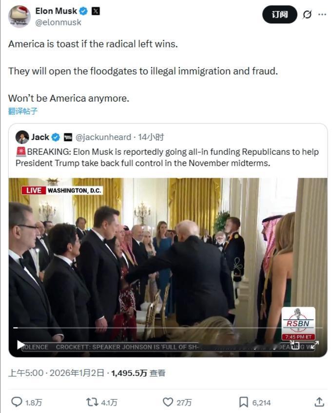 马斯克暗示将全力资助共和党:若激进左翼赢了,美国将不再是美国。进入2026年,美国政坛一大重头戏就是中期选举。据美国右翼保守派小报《纽约邮报》当地时间1月1日报道,一向喜欢染指政治的亿万富翁马斯克当天暗示,他将在今年中期选举前,资助共和党候选人,并声称如果民主党控制国会,美国将走向毁灭。 2024年特朗普胜选后,马斯克以"政府效率部顾问"身份入驻白宫,两人亲密到马斯克可以留宿西厢。但2025年5月推出的"大而美"法案,彻底撕开了同盟的伪装。 这份4万亿美元的税收支出方案,不仅砍掉了特斯拉依赖的电动车补贴,还将国防预算推至历史新高,与马斯克削减国债的主张背道而驰。 当他在国会听证会上怒斥法案"令人作呕"时,特朗普的回应是:"要么闭嘴,要么滚蛋。" 裂痕迅速升级。马斯克先是爆料特朗普出现在,爱泼斯坦案未公开档案中,接着威胁组建"美国党"分走共和党选票。 特朗普则以终止SpaceX的军事合同、取消特斯拉联邦补贴回击,直接导致特斯拉市值蒸发1500亿美元。 那段时间,硅谷流传着段子:"马斯克的推特账号,比国会山的投票按钮还危险。" 2025年12月,特拉华州法院的一纸判决成为转折点。恢复马斯克1390亿美元特斯拉期权的裁定,让他的身家突破7490亿。 财富膨胀的同时,是现实的刺痛——组建第三党需要至少5年布局,而特斯拉的全自动驾驶牌照、SpaceX的火星计划,都等不起两年空窗期。 更关键的是,欧盟1.2亿欧元的罚单袭来时,特朗普团队第一时间声援,称"这是对美国科技的攻击"。这种政商互保的戏码,比任何政治理想都更实在。 共和党中期选举的危急情势,也让马斯克的回归变得紧迫。众议院219:212的微弱优势,意味着共和党每失去一个席位都可能满盘皆输。 据Axios统计,民主党参议院竞选委员会现金储备2.1亿,共和党仅1.78亿,马斯克的"救命钱"成了关键变量。 正如他的政治顾问伯查尔所言:"现在不是赌气的时候,是算总账的时候。" 马斯克的回归,本质是押注共和党能守住国会。但现实远比推特上的口号残酷。 2025年地方选举中,民主党靠"菜篮子工程"在迈阿密、佐治亚等保守选区突围,弗吉尼亚农村选民支持率虽仍落后共和党8个百分点,却创下民主党近十年最佳战绩。 这种"经济议题打败文化战争"的趋势,让共和党慌了神——特朗普的关税政策正在反噬农村选民,2025年爱荷华州农业补贴减少23%,直接导致12个乡村选区倒戈。 更棘手的是"蓝墙褪色"危机。2020-2023年,民主党优势州流失370万人口,流向得州、佛罗里达等共和党州。 虽然南部摇摆州竞争加剧,但密歇根、宾夕法尼亚等传统蓝墙州的郊区正在"共和党化"。 众议院议长约翰逊直言:"失去国会,特朗普的移民政策、减税法案都将归零,万斯2028年大选也将失去跳板。"这种连锁反应,正是马斯克最担心的"美国不再是美国"。 2025年11月的白宫晚宴,特朗普拍马斯克肚子的画面被解读为"破冰"。但真正的和解,藏在账本里: 马斯克承诺注资的超级政治行动委员会,将重点砸向威斯康星、俄亥俄等6个摇摆州;X平台的算法团队,正在为共和党候选人定制选民画像。 农村选民看通胀数据,郊区主妇推教育成本,这比2024年的笼统造势精准十倍。 商人的算盘永远精明。一旦共和党保住国会,SpaceX将锁定NASA的火星计划,特斯拉的自动驾驶审批将加速,连星链计划的国防部订单都可能翻倍。 这些利益,远超过"大而美"法案带来的损失。正如储殷教授所言:"马斯克不是政治家,他是用20亿试水,换2000亿的保单。" 2026年1月的竞选财务报告即将揭晓,马斯克的捐款数字或将创,美国中期选举纪录。 但这场交易里没有温情——特朗普团队清楚,马斯克的支持是"conditional love",随时可能因政策分歧再次翻脸;马斯克也明白,共和党需要的是他的钱,而非他的政治理想。 当X平台的算法继续推送"民主党开放移民"的短视频,当特斯拉的工厂继续申请联邦补贴,美国的权力游戏仍在重复古老的剧本: 商人用钱买政策,政客用权换选票,而真正决定走向的,永远是铁锈带的失业者、玉米地的农场主,和每个月为汽油费发愁的普通人。 马斯克的支票簿救不了分裂的美国,但至少能让他的商业帝国,在红蓝对撞中多撑几年。