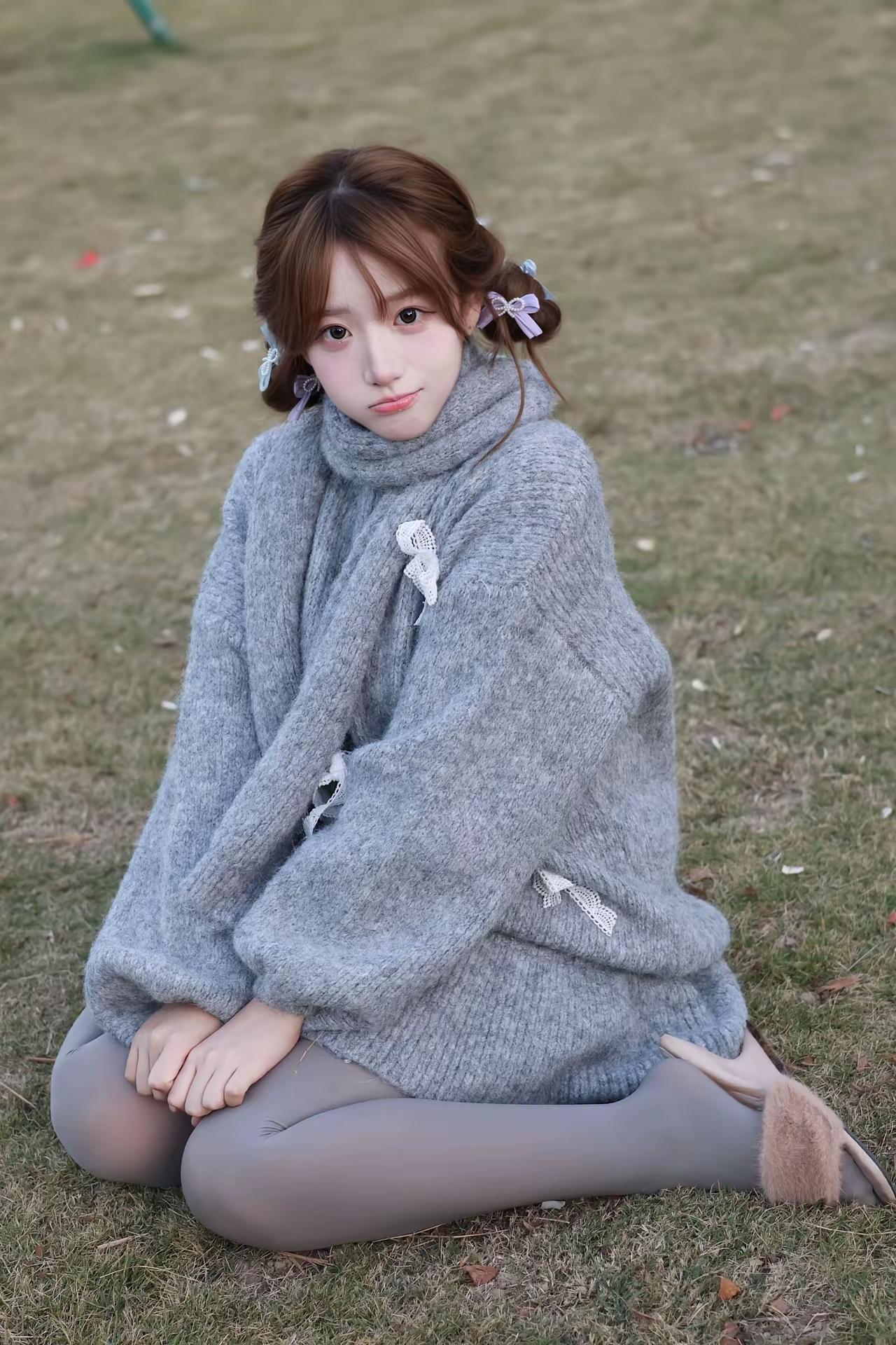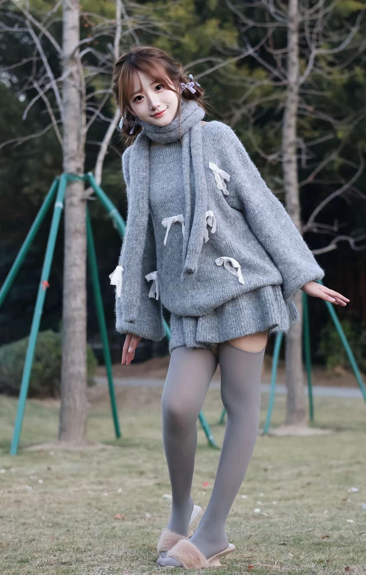 冬日暖阳下,温柔少女漫步在公园里,灰色毛衣与粉色发卡相得益彰,尽显冬日浪漫。