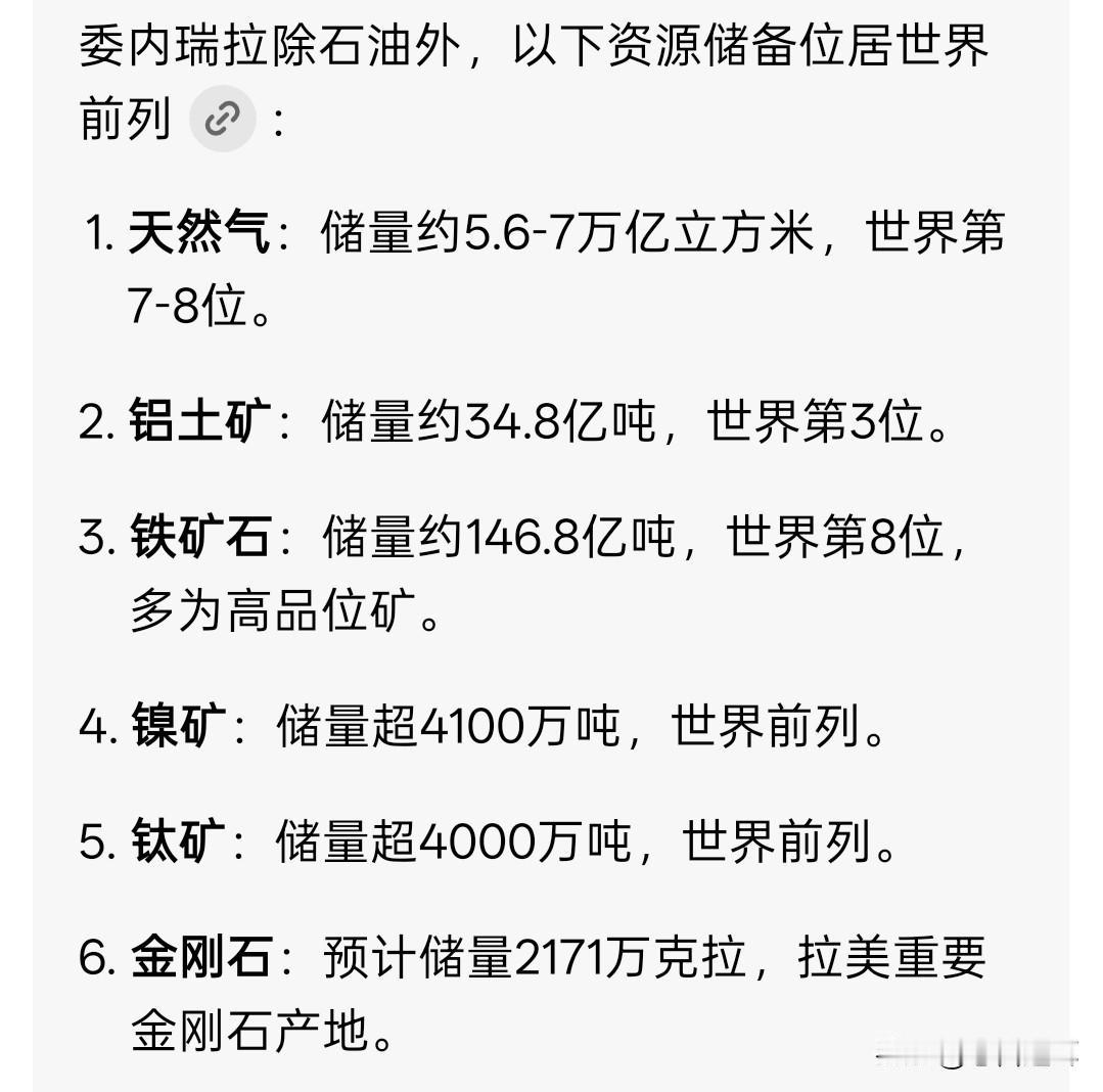 委内瑞拉只是大国全球抢资源的开始,尤其是有色金属 马杜罗被抓,前后也就几个小时时间。这有点匪夷所思,事出反常必有妖…… 从最坏的打算看,也可以理解为最好的结果:委内瑞拉亲美ZF可能会和平上台。 如果从真,这将是国际局势重新洗牌的开始。 一方面,美国快、准、狠的践行他,2025年12月4日提出《国家安全战略》,委内瑞拉就是个开始,后面拉美、南美会一步一步落实,实现他西半球战略。 另一方面,这或许是抢资源的开始。他不会是明抢,而是扶持亲美势力,然后排他。 在人工智能到来的时代,石油已经不是最最重要的资源了。无论是新能源还是机器人,又或是航空航天,他们对有色金属,稀有金属的需求都不是以前能比的。 他们一旦不能通过期货等金融手段控制这些资源,那么只有企业下场控制矿山了。 南美可是铜、铝等有色金属的重要储藏地。委内瑞拉只是个开始,后面的智利、巴西……再到澳洲…… 乌克兰现在悬而未决,南美已经开始,我们怎么面对将来企业被排斥出局。