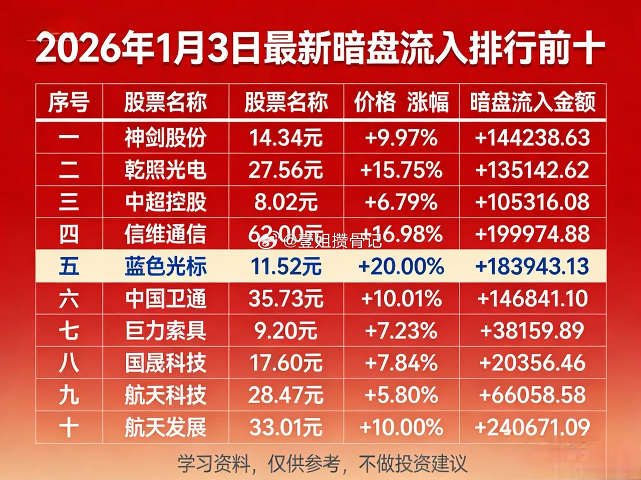 2026 年 1 月 3 日最新暗盘流入排名前十:一、神剑股份 14.34元, +9.97% +144238.63二、乾照光电 27.56 元,+15.75% +135142.62三、中超控股 8.02 元, +6.79% +105316.08四、信维通信 62.00 元 +16.98% +199974.88五、蓝色光标 11.52 元,+20.00% +183943.13六、中国卫通 35.73 元,+10.01% +146841.10七、 巨力索具 9.20 元,+7.23% +38159.89八、 国晟科技 17.60 元,+7.84% +20356.46九、航天科技 28.47 元,+5.80% +66058.58十、 航天发展 33.01 元,+10.00% +240671.09仅供参考,不做投资建议。