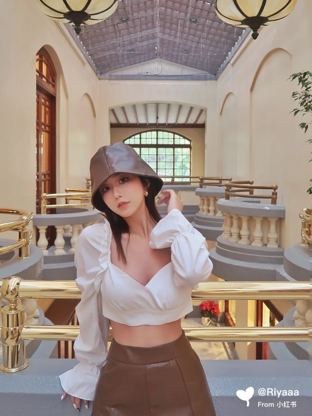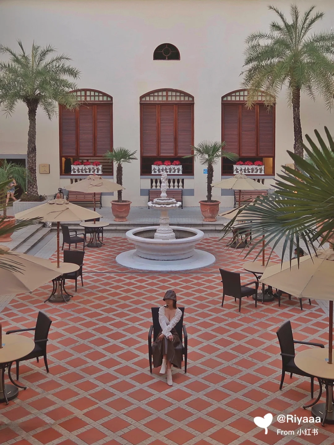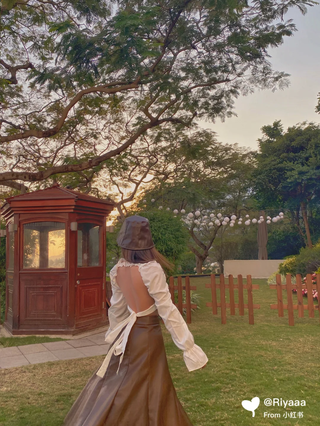 结束后借着夕阳在门口旁的草坪拍照实在太好看啦!复古的亭子及栅栏是很好的背景道具~~接着穿过许多精品店就来到网红打卡点复古楼梯(图1)和一个小露天广场啦~~来的时候广场上坐满了人,等了一个多小时才走的差不多拍到了图2