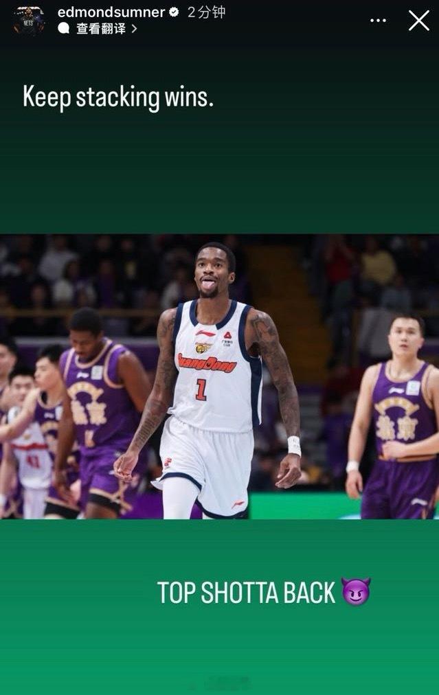 萨姆纳赛后更新社媒账号,庆祝胜利,鼓励全队。北控男篮vs广东男篮广东宏远