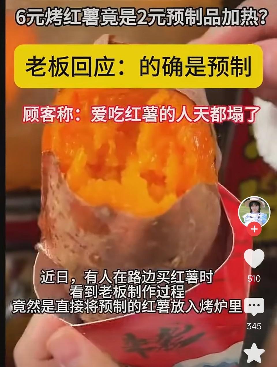 6元烤红薯是2元预制红薯加热! 爱吃烤红薯的人天塌了! 万物皆可预制!烤红薯也是! 客人看到烤红薯老板拿出半成品地瓜进烤炉崩溃了…… 让我说,这很正常吧?这东西不能一直烤着呀,先烤上几个准备着,来人买加热一下,不然等着现烤的话,客人估计早跑了。 从头开始烤一个红薯最快也要半个钟,谁等得了那么久,肯定先烤好,人来了再热一下啊!这和去饭店吃梅菜扣肉一样! 再次加热的半成品烤地瓜,你能接受吗? 烤红薯 红薯烤红薯 爆汁烤红薯 土炉烤红薯 你喜欢吃烤红薯还是煮红薯?
