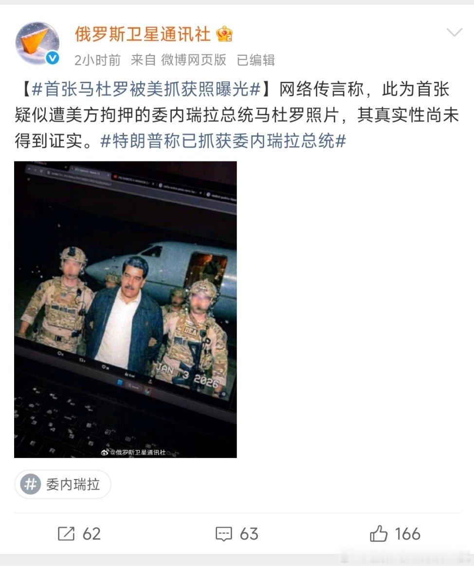 特朗普称已抓获委内瑞拉总统疑似委内瑞拉总统马杜罗被抓照。来源:俄罗斯卫星通讯社。