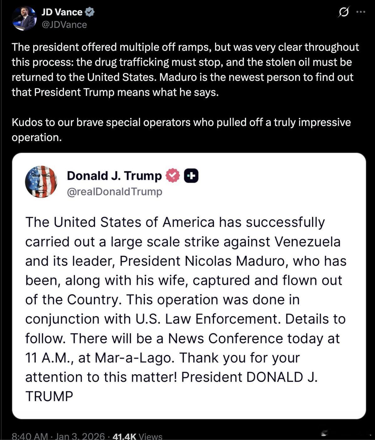特朗普称已抓获委内瑞拉总统 美国副总统万斯:“总统提出了多种解决方案,但始终立场明确:必须停止毒品走私,被盗石油必须归还美国。马杜罗是最新一个体会到特朗普总统言出必行的人。向我们勇敢的特种部队致敬,他们成功完成了一次令人印象深刻的行动。”
